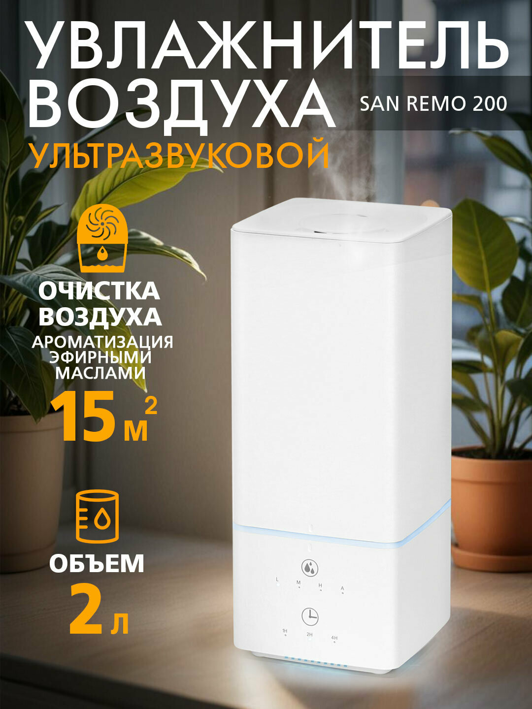 Ультразвуковой увлажнитель VLK SAN REMO 200 создан для помещений до 15 м². Три скорости увлажнения позволяют выбирать оптимальную интенсивность. Возможность ароматизации эфирными маслами и специальный аромарежим наполнят комнату любимыми запахами. Сенсорное управление облегчает настройку, а таймер до 4 часов автоматически регулирует время работы.
