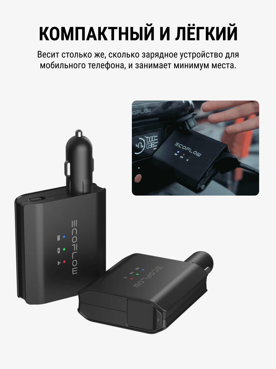 Интеллектуальное автомобильное зарядное устройство EcoFlow - незаменимый аксессуар в дороге. Идеально подходит для поездок в глуши, где требуется зарядить аккумулятор автомобиля.
