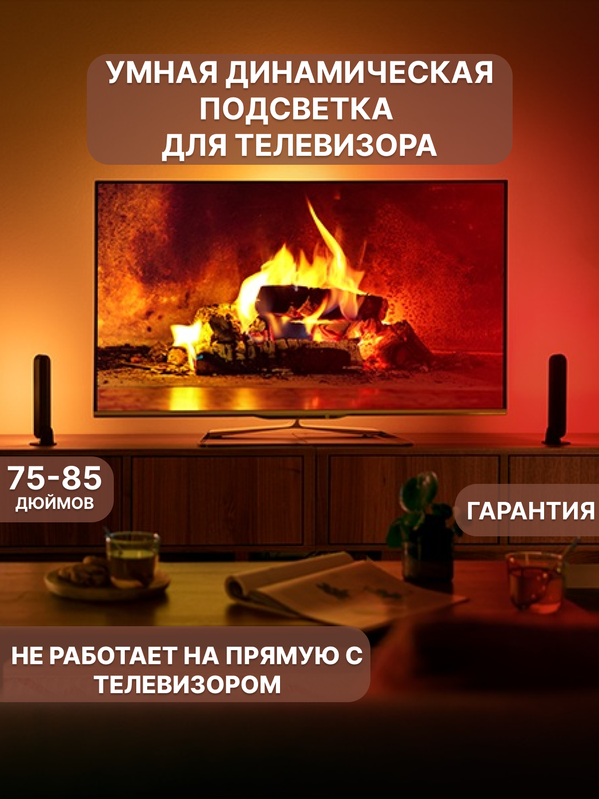 Умная подсветка для телевизора Ambilight 75-85 Дюймов это уникальный источник света, который поможет создать уютную атмосферу в комнате. Вы также можете использовать голосовые помощники, такие как Алиса для управления светодиодными лампами, которые синхронизируются с телевизором. Устройство поддерживает WiFi. Умная подсветка обладает множеством функций, синхронизация с изображением на телевизоре меняющихся в такт музыки, видео и игр, эффект домашнего кинотеатра.