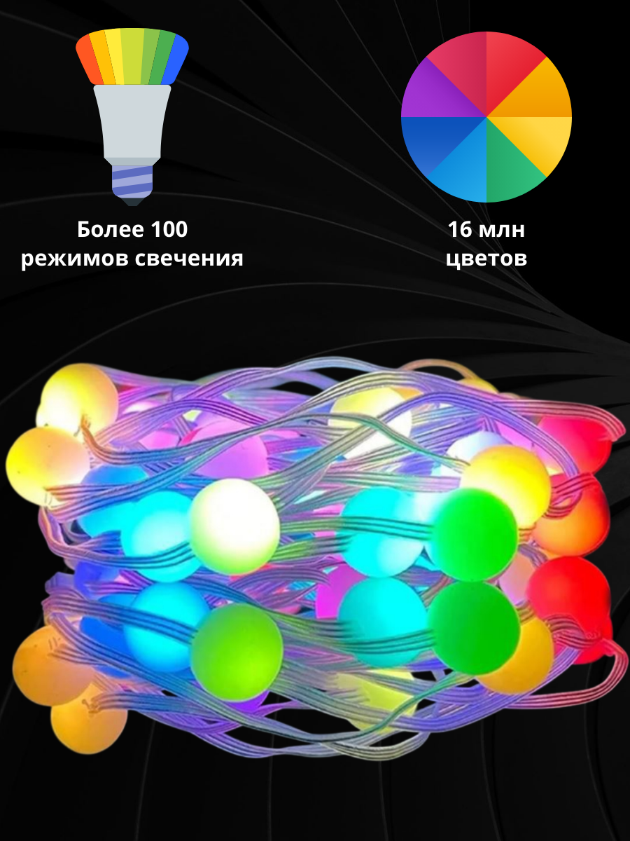 Умная гирлянда шарики RGB с управлением через смартфон, пульт ДУ, 7 метров