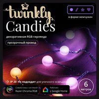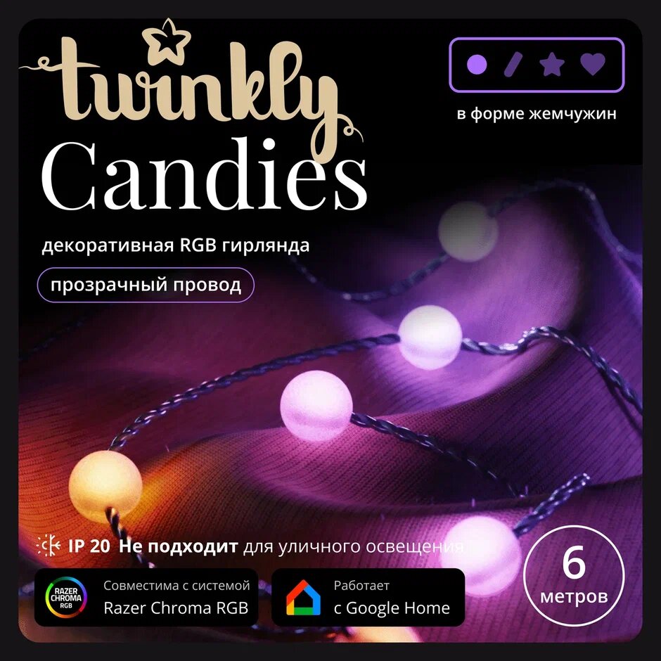 Умные декоративные светильники Twinkly Candies, выполненные в форме жемчужин, привносят очарование в любое жилое пространство вашего дома благодаря необычайной яркости, настраиваемым эффектам с телефона и легкой портативной конструкции. Хотите ли вы создать уютное свечение в детской комнате, создать завораживающую потоковую установку, придать праздничности или добавить индивидуальный штрих в интерьер. Создайте атмосферу с помощью Candies. Управляемая приложением световая гирлянда – легко управляйте гирляндой с помощью удобного приложения Twinkly для iOS и Android на мобильных устройствах и планшетах. Дайте волю своему творчеству – наслаждайтесь множеством готовых к воспроизведению настраиваемых эффектов и анимацией или создайте свое уникальное световое шоу. Группируйте несколько устройств Twinkly – создавайте более крупные синхронизированные украшения, комбинируя свои Twinkly Candies с другими устройствами Twinkly. Работает с Amazon Alexa и Hey Google - Управляйте без помощи рук, интегрируя Twinkly Candies с выбранными устройствами Smart home. Умный контроллер с кабелем питания USB-C в комплекте – возьмите Twinkly Candies с собой куда угодно, благодаря их легкому портативному дизайну. Синхронизация музыки с помощью Twinkly Music Dongle (приобретается отдельно). Длина 6 метров. Расстояние между лампами - 6 см.