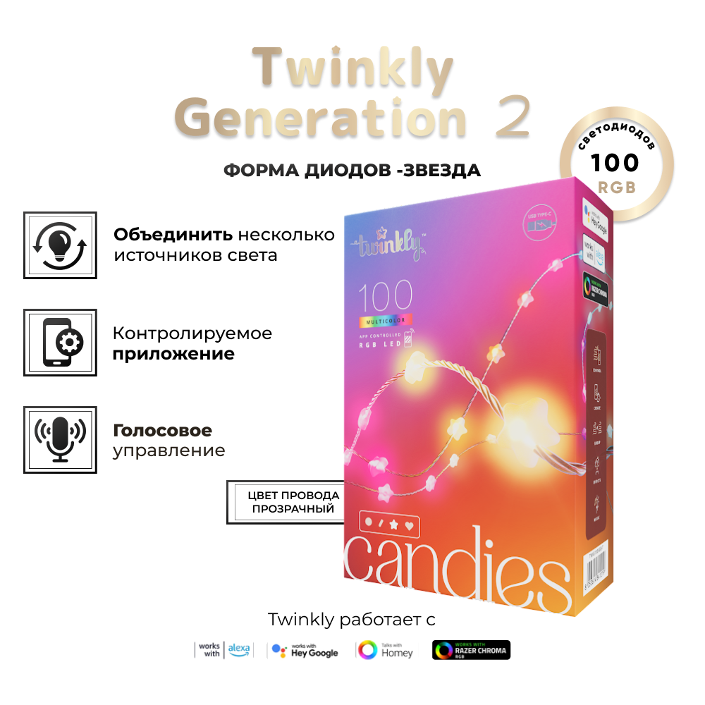 Купить Умная гирлянда Twinkly Candies Stars RGB, в форме звезды, 100 диодов, прозрачный провод, BT+WiFi, IP20 с доставкой по всей России. Умная гирлянда Twinkly Candies Stars RGB, в форме звезды, 100 диодов, прозрачный провод, BT+WiFi, IP20: сравнение цен, характеристики, фото, актуальное наличие и цены.