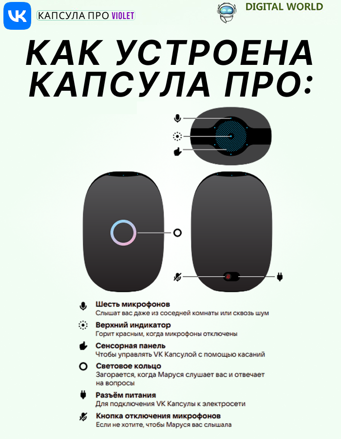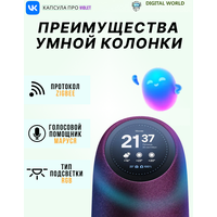 VK Капсула Про — флагманская умная колонка с голосовым помощником Марусей и умным домом внутри. Акустическая система с технологией пространственного звучания — это три динамика общей мощностью 65 Вт и звук, который погружает в музыку. Смелый дизайн создан Каримом Рашидом — его работы украшают лучшие музеи мира. Сенсорный экран показывает музыку в удобном плеере, погоду, функции Маруси, данные умного дома. Циферблат можно менять одним движением — под интерьер или по настроению. Умный дом в колонке. Встроенный Zigbee-хаб объединит умные устройства от 70+ брендов, чтобы вы управляли ими голосом. А встроенные датчики влажности, температуры, движения и освещённости выведут домашний комфорт на новый уровень. Дружелюбный голосовой помощник Маруся поможет с делами и отдыхом. Теперь Маруся усилена нейросетями от VK! Она ещё лучше отвечает на вопросы: изучает надёжные источники, выделяет главное и даёт полный, но ёмкий ответ. Подписка VK Музыка + Wink на 3 месяца в подарок