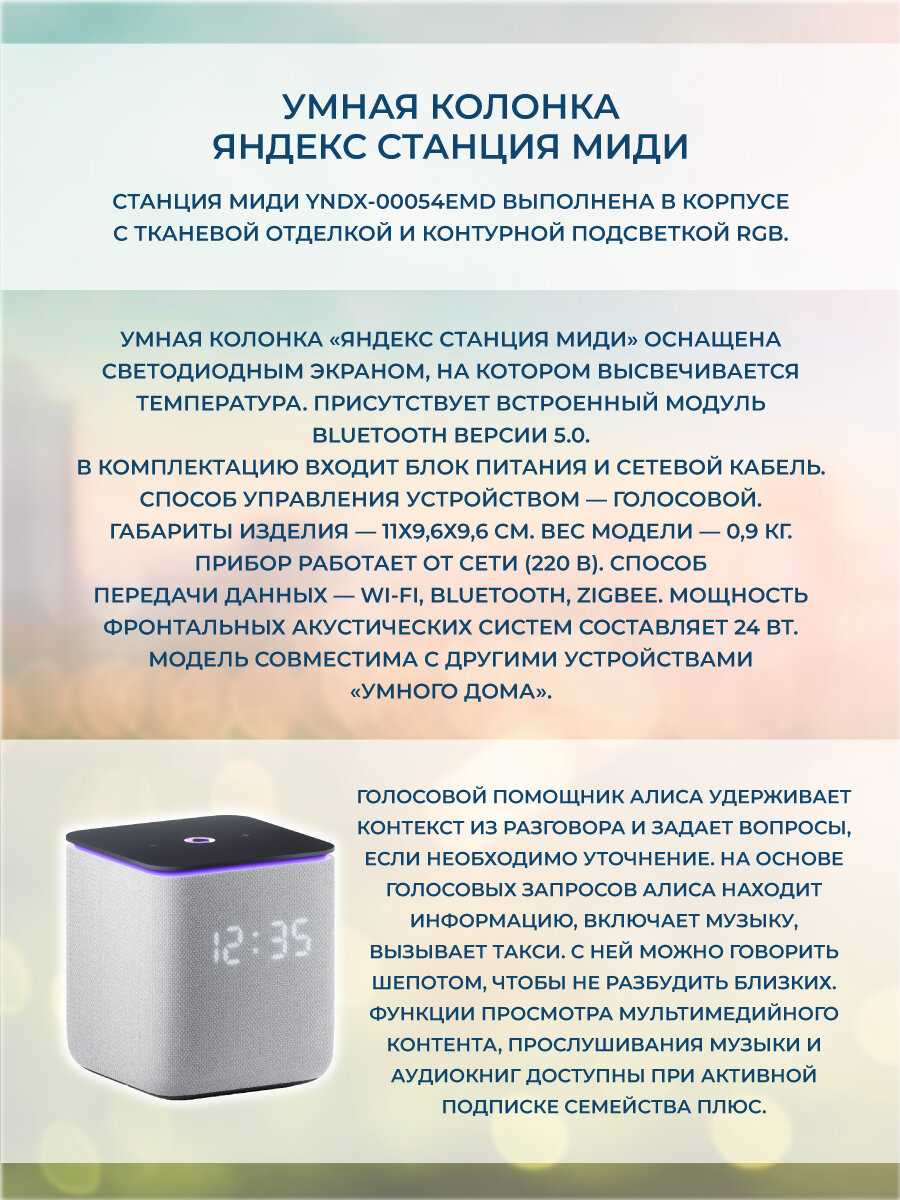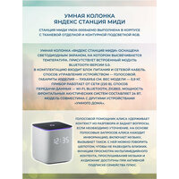 Яндекс Станция Миди — умная колонка с виртуальным ассистентом Алисой, мощным звучанием 24 Вт в компактном корпусе. Благодаря переходу на нейронный процессор Станция Миди быстрее обрабатывает запросы, а значит, Алиса быстрее откликается на команды и точнее узнаёт людей по голосу. LED-дисплей показывает время, погоду и реакции Алисы, а также оснащён активной контурной LED-подсветкой.