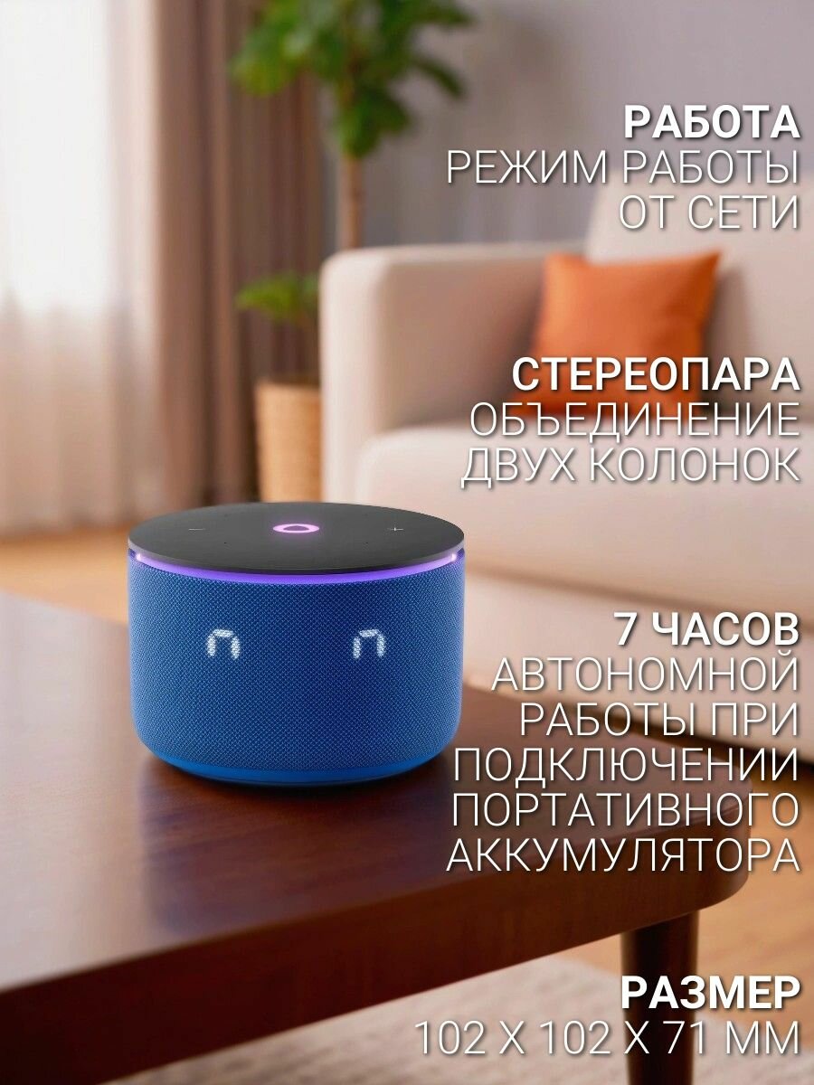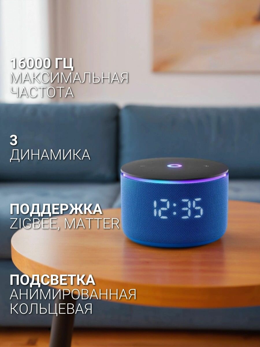 Станция Мини 3 Про от Яндекса стала настоящим прорывом в мире компактных колонок. В отличие от предыдущих моделей, она оснащена встроенными модулями Zigbee, Wi-Fi и Matter over Wi-Fi, что позволяет ей управлять устройствами умного дома даже без подключения к интернету, если те поддерживают такие же протоколы. Колонку можно кастомизировать под себя: подключите внешний аккумулятор — и получите до 7 часов автономной работы, или добавьте климатический блок с датчиками температуры, влажности и CO2. Всё это открывает двери к созданию умных сценариев: включение увлажнителя, открытие окон, проветривание и многое другое. Внутри компактного корпуса скрывается 18-ваттный динамик и два пассивных излучателя, усиливающих басы. Звучание стало заметно богаче и глубже по сравнению с «Станцией Мини 3» — вы почувствуете это сразу после первого запуска. «Станция Мини 3 Про» работает с голосовым помощником Алиса, который поможет включить музыку, узнать погоду, управлять техникой, создать напоминание или даже рассказать сказку. Её приятно поставить и на полку, и на кухню — она выглядит современно и лаконично. Яндекс Станция Мини 3 Про — идеальный выбор для тех, кто хочет компактную колонку с максимумом возможностей, Подкатегория: Умные колонки, Модель: YNDX-00059, Беспроводные интерфейсы: Wi-Fi, ZigBee, Bluetooth, Питание: от сети, Расположение регуляторов звука: на верхней панели, Цвет: синий, Материал корпуса: пластик, Страна производства: Китай, Вес с упаковкой (кг): 0.5 кг, Длина упаковки: 11, Высота упаковки: 8, Ширина упаковки: 11, Комплектация: Умная колонка Яндекс Станция Мини 3 Про, черный, Минимальная воспроизводимая частота: 90 Гц, Максимальная воспроизводимая частота: 16000 Гц, Вес без упаковки (кг): 0.44 кг, Глубина предмета: 10.7 см, Высота предмета: 7.1 см, Ширина предмета: 10.7 см, Интерфейс: USB Type-C, Мощность акустики: 18 Вт, Доп. опции умной колонки: голосовой помощник, Тип дисплея/экрана: LED (светодиодный), Версия Bluetooth: 5.0, Стандарт Wi-Fi: 802.11 b/g/n/ac, Количество портов USB: 1 шт, Микрофон: встроенный, Количество динамиков: 1 шт, Бренд: Яндекс
