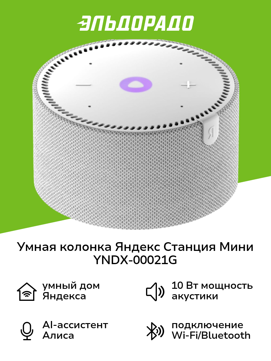 | Дополнительная информация | LED-экран в версии с часами: 32 светодиода белого цвета (4 цифры по 7 сегментов + 4 служебных символа); 3 сенсорные кнопки, разъём питания (DC jack) 4 мм; комплектация: Яндекс Станция Мини, адаптер питания, кабель питания, документация, набор наклеек; при покупке с полной оплатой в подарок 1 месяц подписки Яндекс.Плюс; радиус действия Bluetooth: до 10 м; аудиовход: 3.5 мм jack; напряжение: 100-240 В |