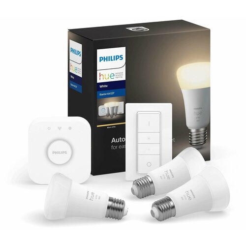 Умная лампа Philips Hue White Starter Kit A60 E27 9Вт 800Лм 3 set RUS, 3 белые лампы с диммером и мостом (929001821620): сравнение цен, характеристики, фото, актуальное наличие и цены.