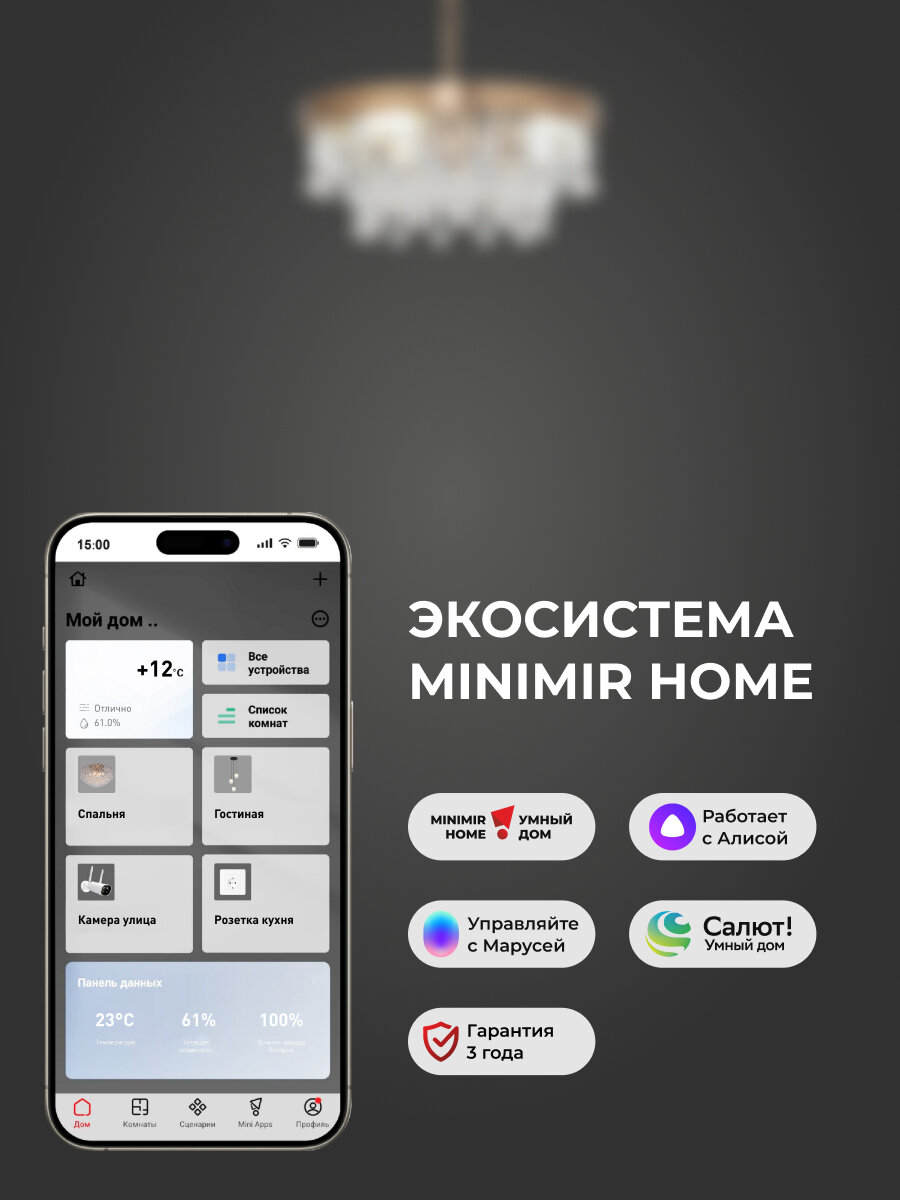 | Дополнительная информация | Лампы в комплект не входят / Умный дом Minimir Home / Голосовое управление: Алиса (Яндекс), Маруся (VK) и Салют (Sber) / Tuya Smart / Умные сценарии / Умный дом Minimir Home / Голосовое управление: Алиса (Яндекс), Маруся (VK) и Салют (Sber) / Tuya Smart / Умные сценарии |