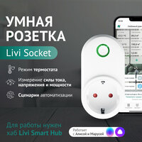 | Дополнительная информация | измеряет мгновенное напряжение в сети и потребляемую мощность подключенных устройств; требуется подключение через хаб Livi Smart; мощность радиоканала 25 мВт; питание от 90 до 250 В (50/60 Гц); потребляемая мощность до 1 Вт; защита по напряжению от 161 до 264 В; защита по температуре 70 °С; можно использовать в качестве термостата |