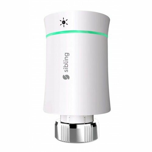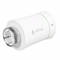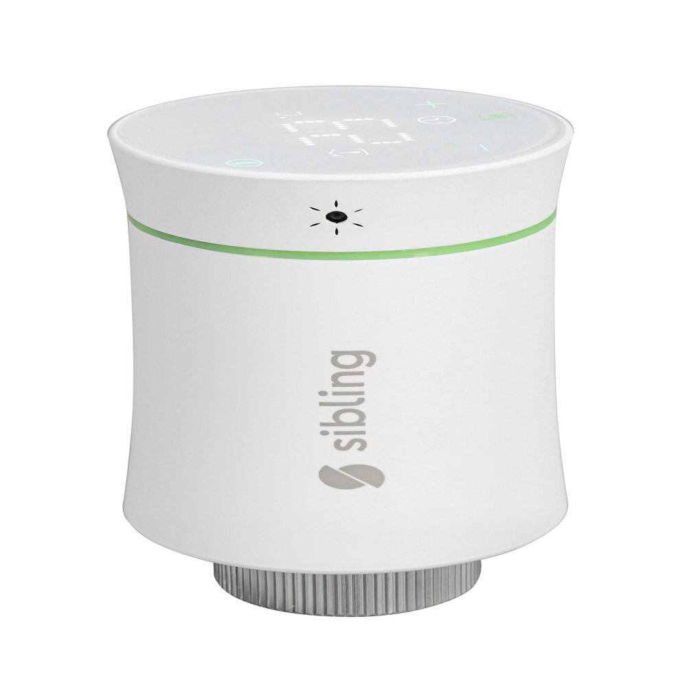 Умная термоголовка Sibling устанавливается на клапан радиатора или контур тёплого пола. Поддерживает заданную температуру, управляя обычным штоком заслонки домашней батареи. Работает через приложение Sibling.