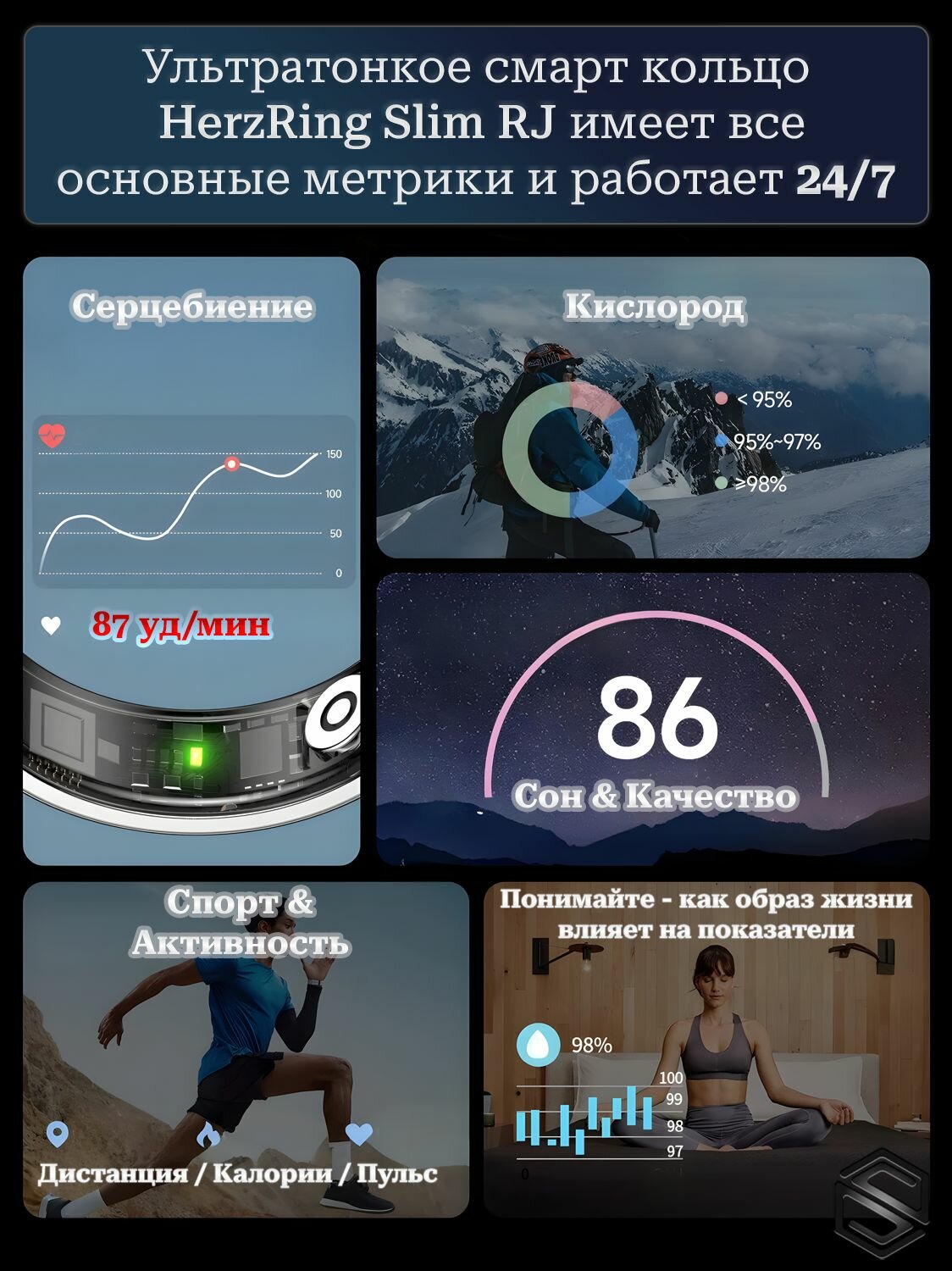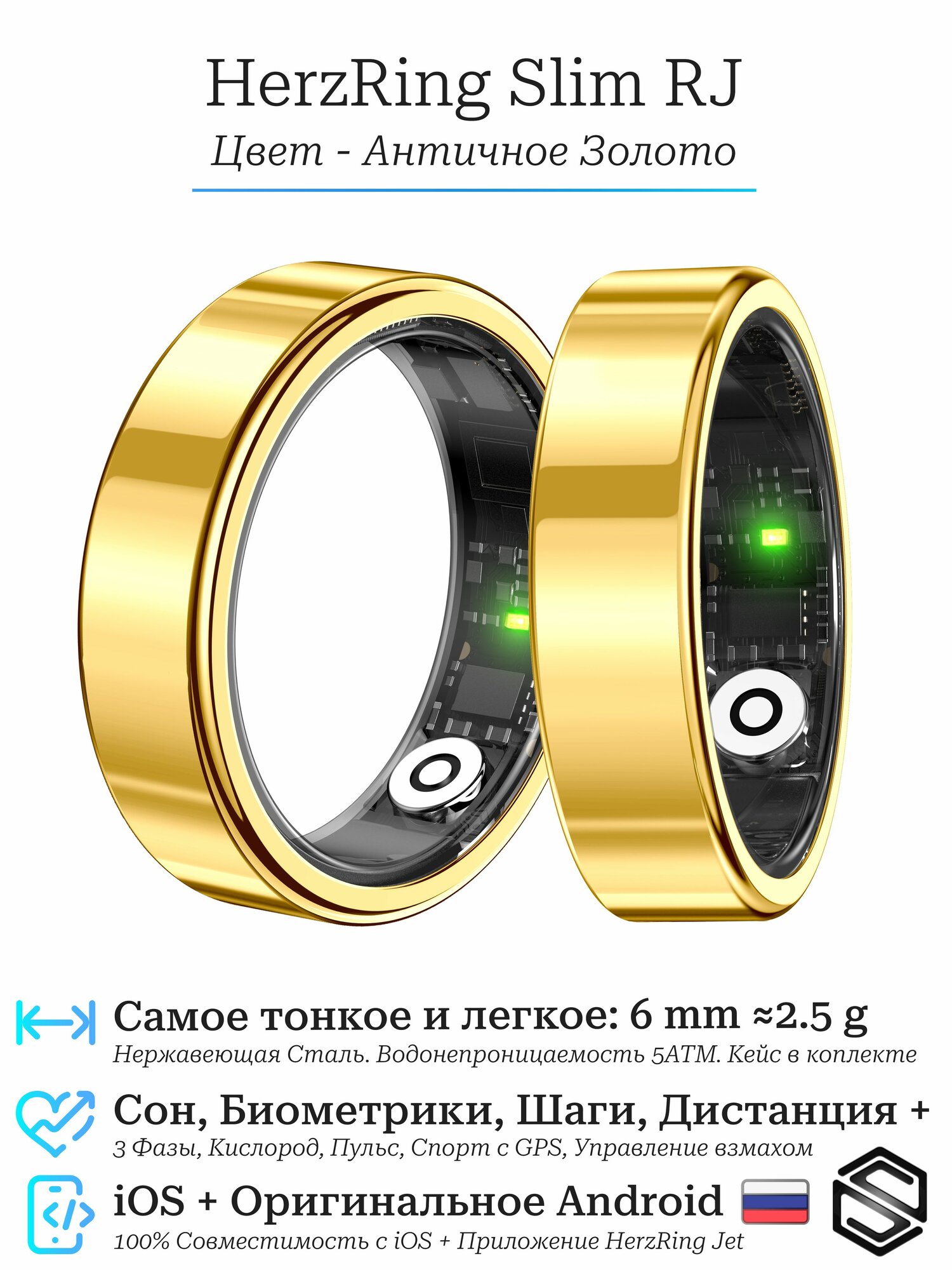 Сверхтонкое Умное кольцо HerzRing Slim RJ - это полноценное смарткольцо в тончайшем и элегантном корпусе, оно практически не заметно, но поможет вам контролировать свое здоровье 24/7 - сон, калории, шаги, кислород и следить за своим прогрессом в спорте. Это тонкое умное кольцо с управлением взмахами (свайпы/скролл вертикальный или активация камеры), которое измеряет пульс, шаги и уровень кислорода в крови, а также подробно записывает сон с разбиением по фазам (засыпание, быстрый REM сон, глубокий) Не смотря на удивительно маленький размер (2.5 мм толщина и 6.5 ширина/глубина) сверх маленьким весом около 3 грамм (в зависимости от размера) заряда хватает на долгое время, до 5 дней круглосуточного мониторинга, а с помощью кейса, который мы дарим в подарок, срок автономной работы можно продлить до месяца. Умное кольцо HerzRing Slim RJ с зарядным кейсом в комплекте - это незаметный помощник и идеальный подарок для себя или близких, который поможет вам сохранять здоровье и достигать своих целей в спорте.