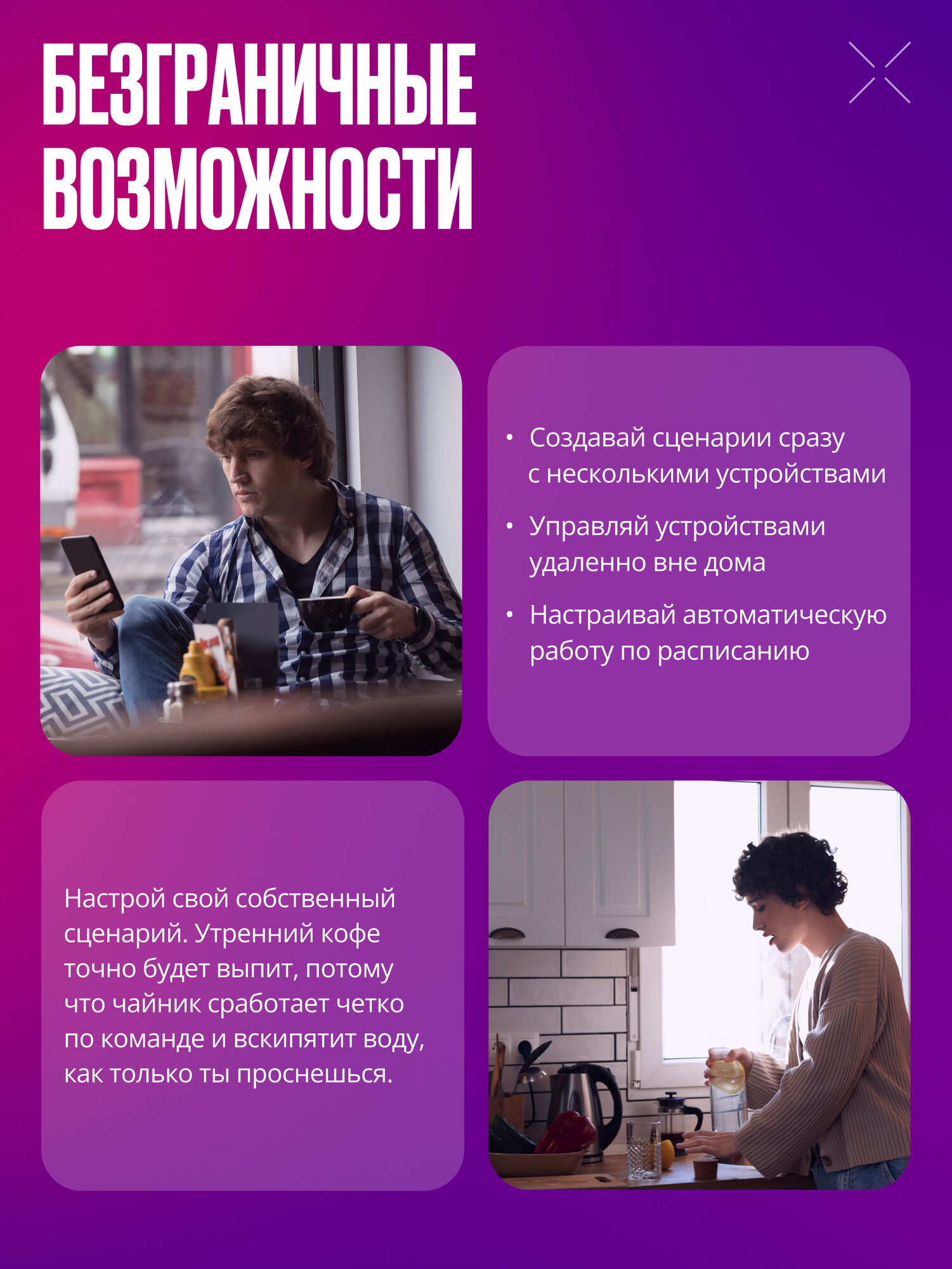 - включаются голосом или по сценарию датчика.