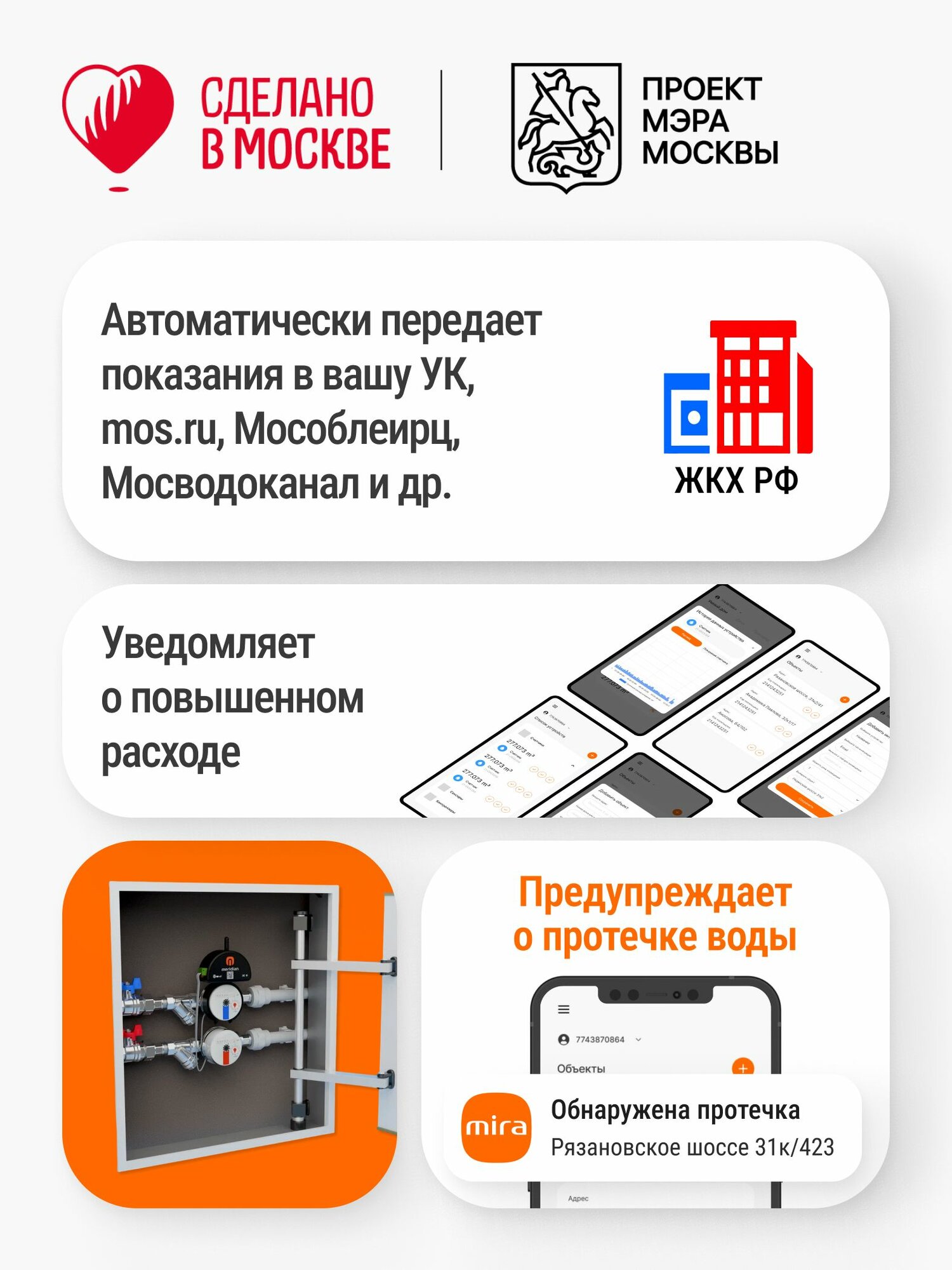 - оповещения о различных ситуациях (протечка, излишний расход)