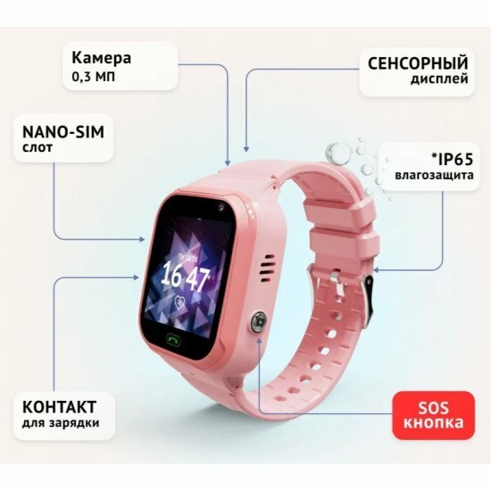 | Дополнительная информация | особенности: записная книжка - 15 номеров, магнитная зарядка, режим "Не беспокоить", функция "Обратный звонок", кнопка SOS, гео-зоны, Anti-lost, история перемещений, фонарик, математическая игра, смена заставки; функции детских часов: телефонные звонки, текстовые сообщения, голосовые сообщения, видеозвонки, фото, расписание занятий; дополнительные функции: видеозвонки, обмен голосовыми сообщениями, режим удаления влаги из часов, будильник |