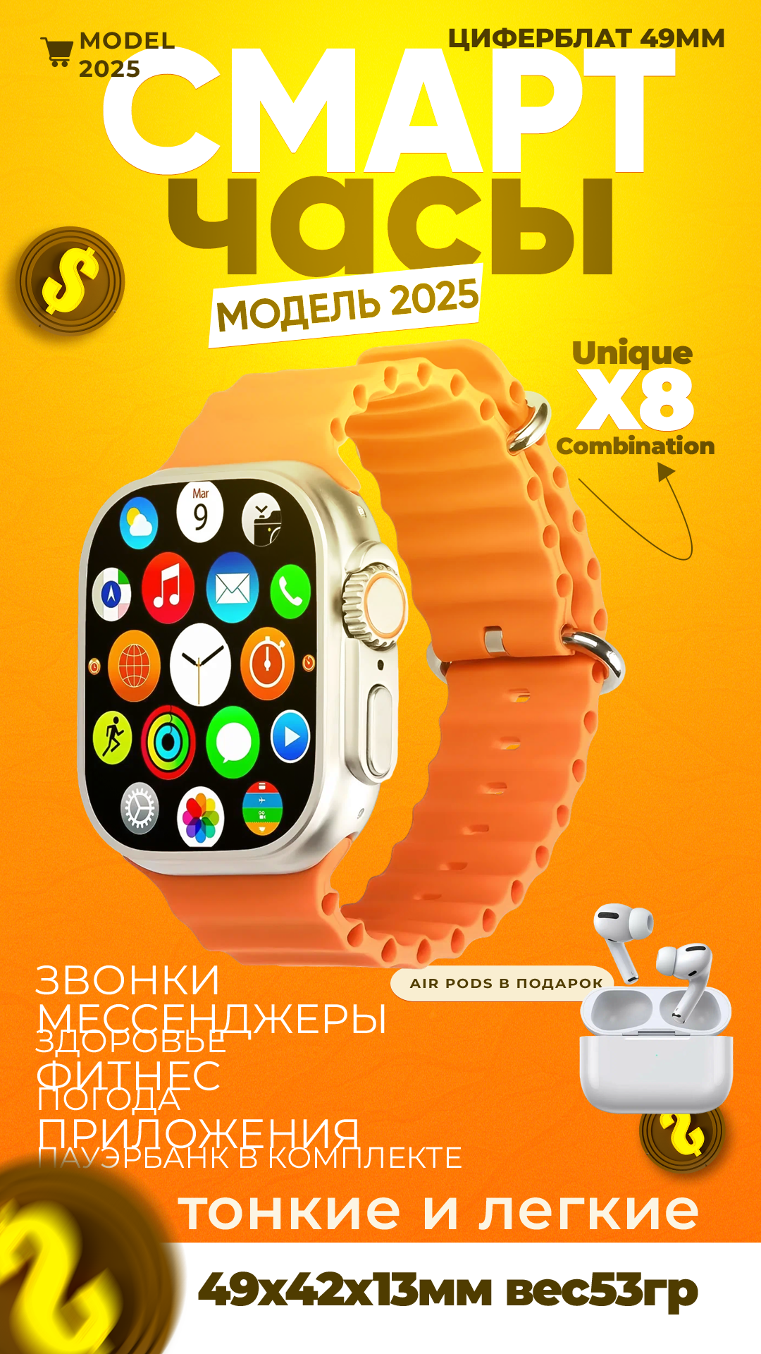 Смарт часы Smart Watch X8 Ultra 2025, 49 mm, наручные умные смарт часы мужские, женские. Оранжевые: сравнение цен, характеристики, фото, актуальное наличие и цены.