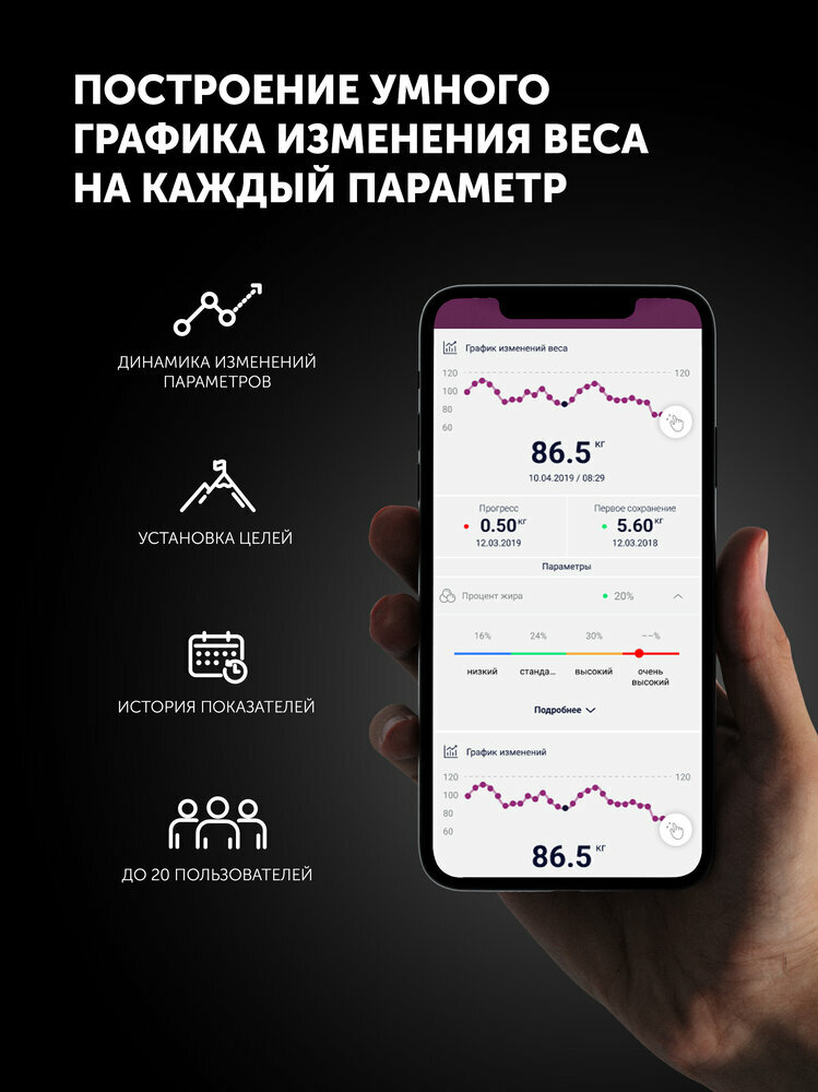 Технические характеристики: Тип весов: электронное Максимальный измеряемый вес: 180 кг Наименьший предел взвешивания: 5 кг Цена деления: 0.1 кг Функция памяти, кол-во пользователей: 20 Сенсорная система для максимально точного определения веса: да Автоматическое обнуление результата: да Измерение уровня воды, жира, мышечной и костной массы в организме: да Измерение коэффициента BMI, жировой массы: да Индикация работы батареек: да Индикация превышения максимального веса: да Синхронизация с iOS/Android: да (через порт Bluetooth 4.0) Бесплатное приложение Polaris Bodyfit: да (доступно для скачивания) Батарейки в комплекте: да Ультратонкие: да Широкая платформа: да Материал платформы: стекло, пластик Питание: 2х1.5V AAA Размеры (ВхШхГ): 2.2х30х26 см Вес: 1.17 кг Цвет: графитовый