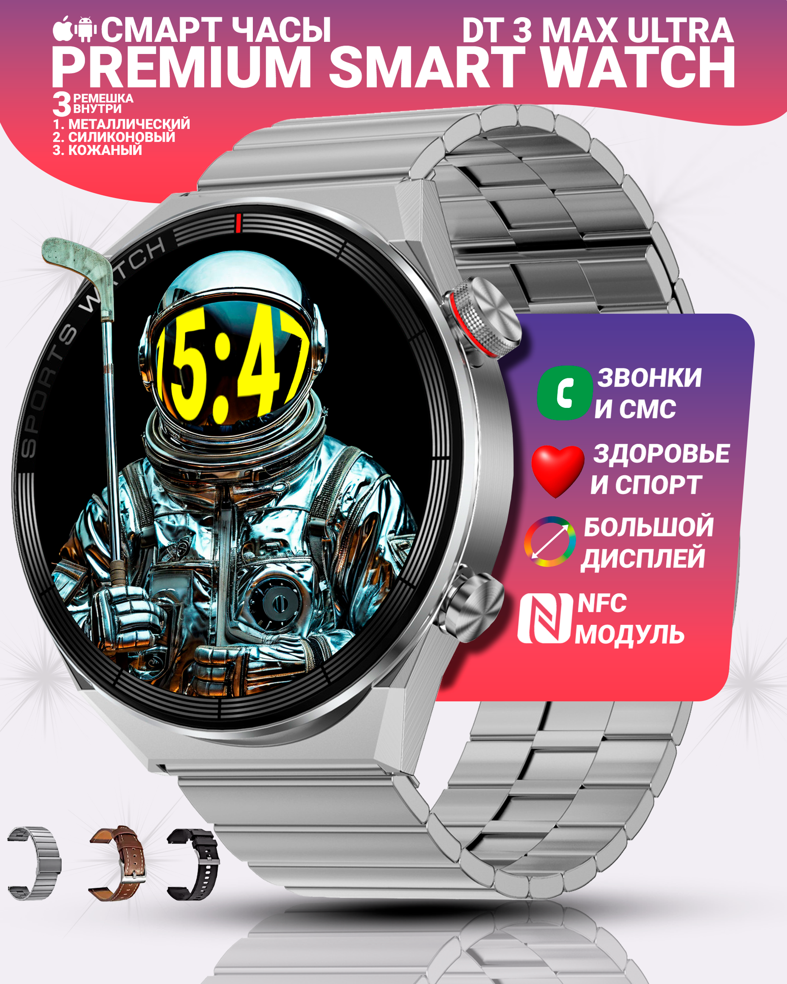 Умные смарт часы, DT3 MAX ULTRA DT №1, Premium smart watch, 3 ремешка, уведомления, NFC, серебристые: сравнение цен, характеристики, фото, актуальное наличие и цены.