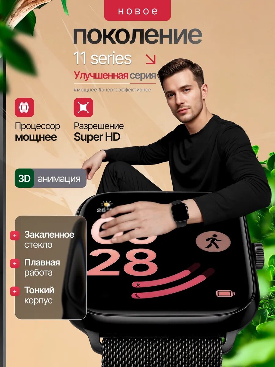 Умные смарт-часы 11 Smart watch - стильная новинка, созданная как альтернатива популярным премиальным моделям. Это не копия Apple Watch, но дизайн и функциональность относятся к премиум сегменту. Женские и мужские смарт часы объединяют фитнес-браслет, смартфон и полноценных смарт-часов. Устройство совместимо со смартфонами Android и iOS, как эпл вотч.