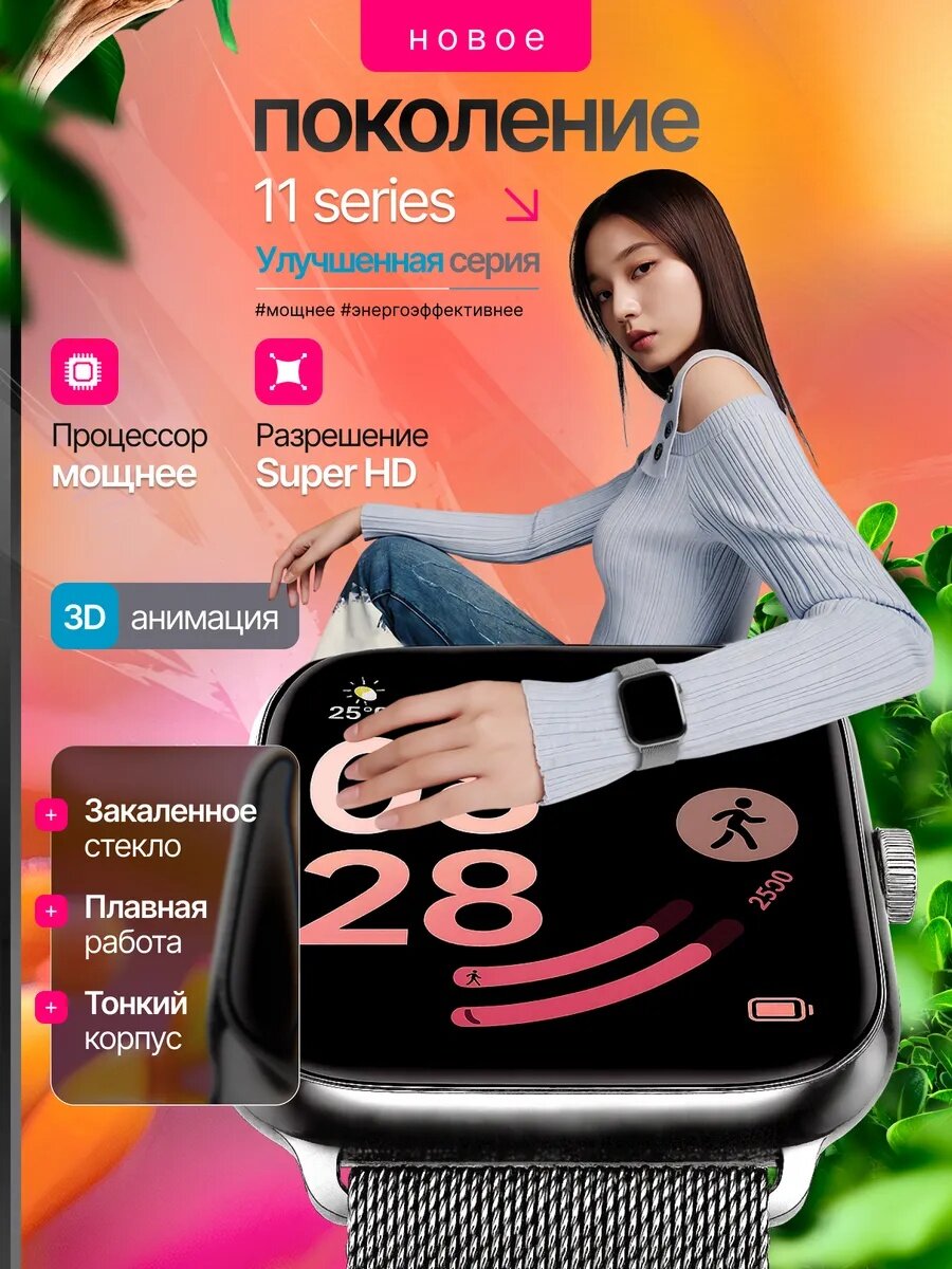 Умные смарт-часы 11 Smart watch - стильная новинка, созданная как альтернатива популярным премиальным моделям. Это не копия Apple Watch, но дизайн и функциональность относятся к премиум сегменту. Женские и мужские смарт часы объединяют фитнес-браслет, смартфон и полноценных смарт-часов. Устройство совместимо со смартфонами Android и iOS, как эпл вотч.