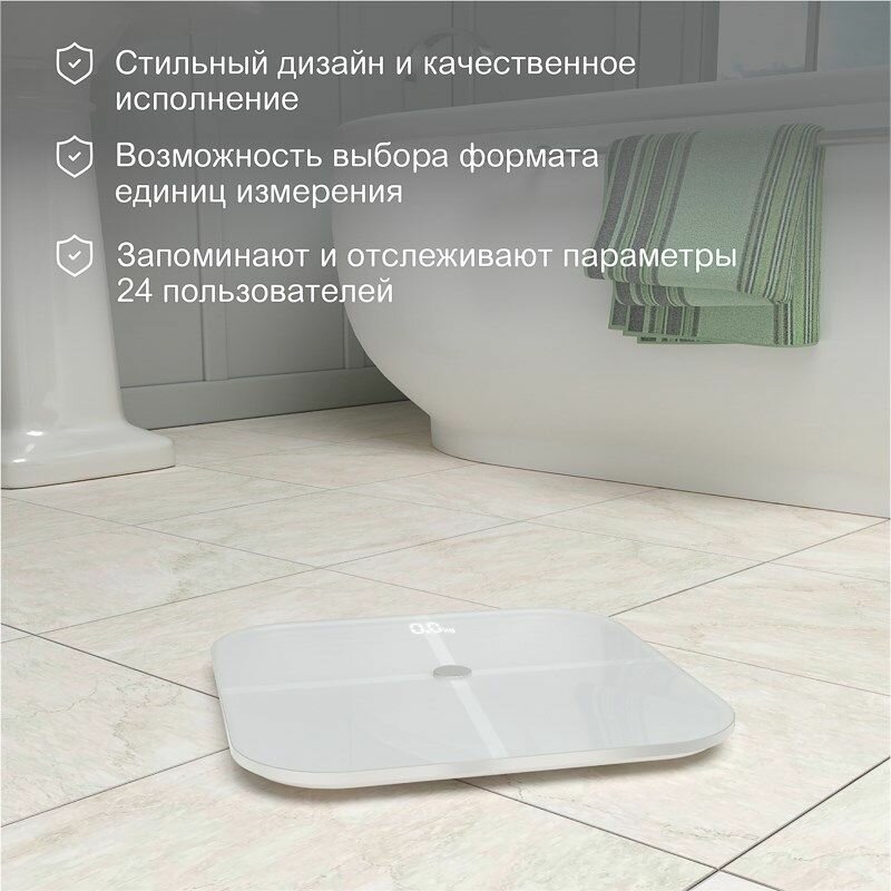 | Дополнительные функции | измерение роста, измерение температуры воздуха, определение доли воды, определение доли жировой ткани, определение доли костной ткани, определение доли мышечной ткани, память, постановка цели |