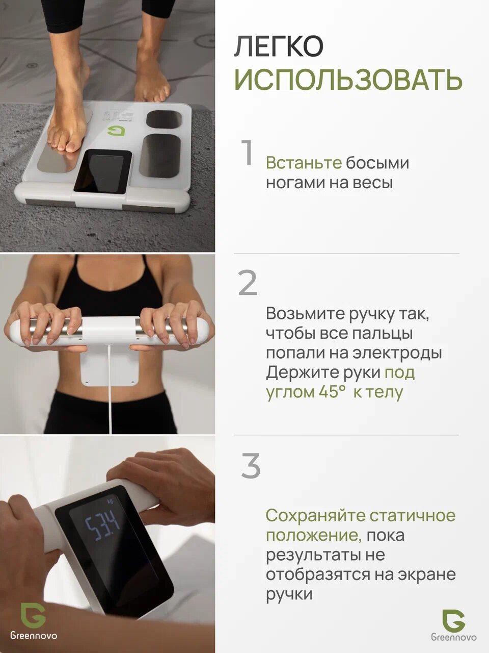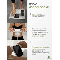 | Дополнительные функции | определение доли воды, определение доли жировой ткани, определение доли костной ткани, определение доли мышечной ткани, память, постановка цели, расчет ИМТ (BMI), расчет ежедневной нормы калорий |
