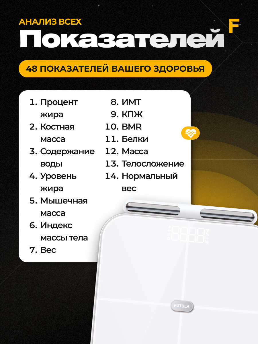 | Дополнительная информация | Висцеральный жир, Индекс массы тела, Костная масса, Мышечная масса, Основной обмен веществ (BMR), Содержание воды, Тип телосложения |