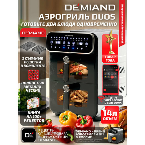 Умный аэрогриль с Wi-Fi DEMIAND DUOS DK-2100 — технологии, вкус и абсолютный комфорт DEMIAND DUOS DK-2100 Wi-Fi — это умный аэрогриль нового поколения, созданный для тех, кто хочет готовить быстро, современно и без лишних усилий. Он объединяет стильный дизайн, высокие технологии и продуманную конструкцию с двумя независимыми чашами, позволяя одновременно готовить разные блюда и полностью контролировать процесс через смартфон. DUOS делает кухню удобной, функциональной и вдохновляющей — каждый день. Управление со смартфона — DEMIAND Пульт Аэрогриль поддерживает управление через приложение Wi-Fi Пульт Demiand, которое открывает доступ ко всем функциям прямо с телефона. Вы можете: • регулировать температуру и время; • включать и останавливать программы; • переключать режимы для каждой чаши отдельно; • ставить на паузу и возобновлять готовку; • получать уведомления о готовности блюда; • контролировать процесс из любой комнаты. Приложение делает работу с аэрогрилем максимально удобной: больше не нужно находиться рядом, чтобы следить за приготовлением. Всё управление — в вашем смартфоне. Библиотека рецептов в вашем телефоне — приложение Demiand Рецепты DUOS полностью раскрывает свой потенциал вместе с приложением «Demiand Рецепты» — цифровой кулинарной библиотекой, созданной совместно с шеф-поваром бренда Demiand. Внутри вы найдёте более 200 рецептов, и каждый включает: • пошаговые фото- и видео-инструкции; • настройки времени и температуры; • рекомендации по ингредиентам; • советы от шеф-повара; • возможность сохранять любимые рецепты.