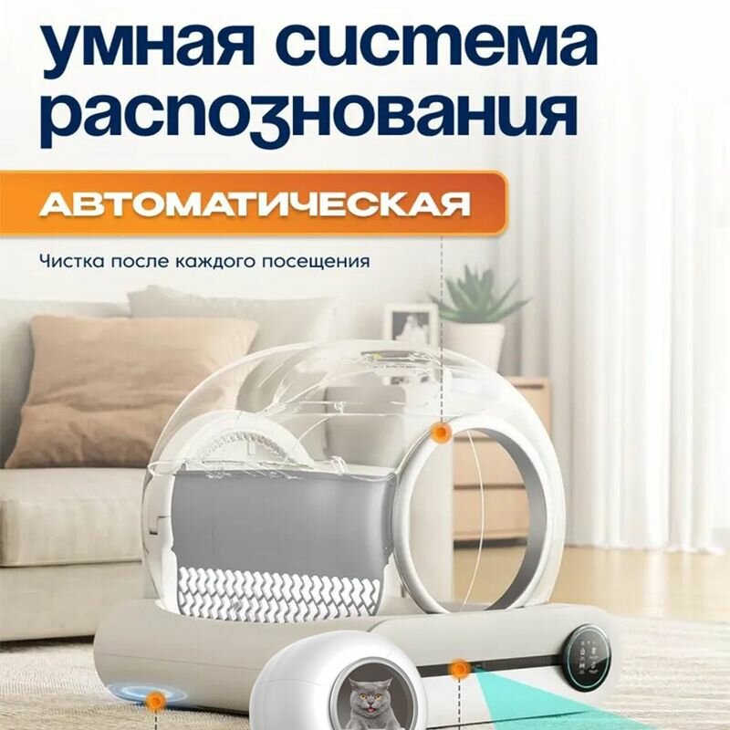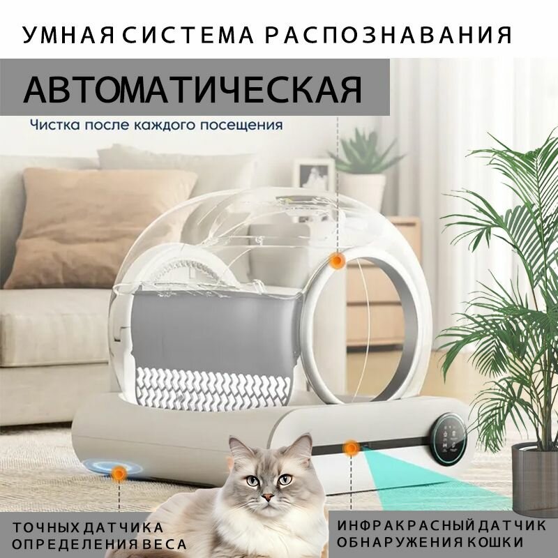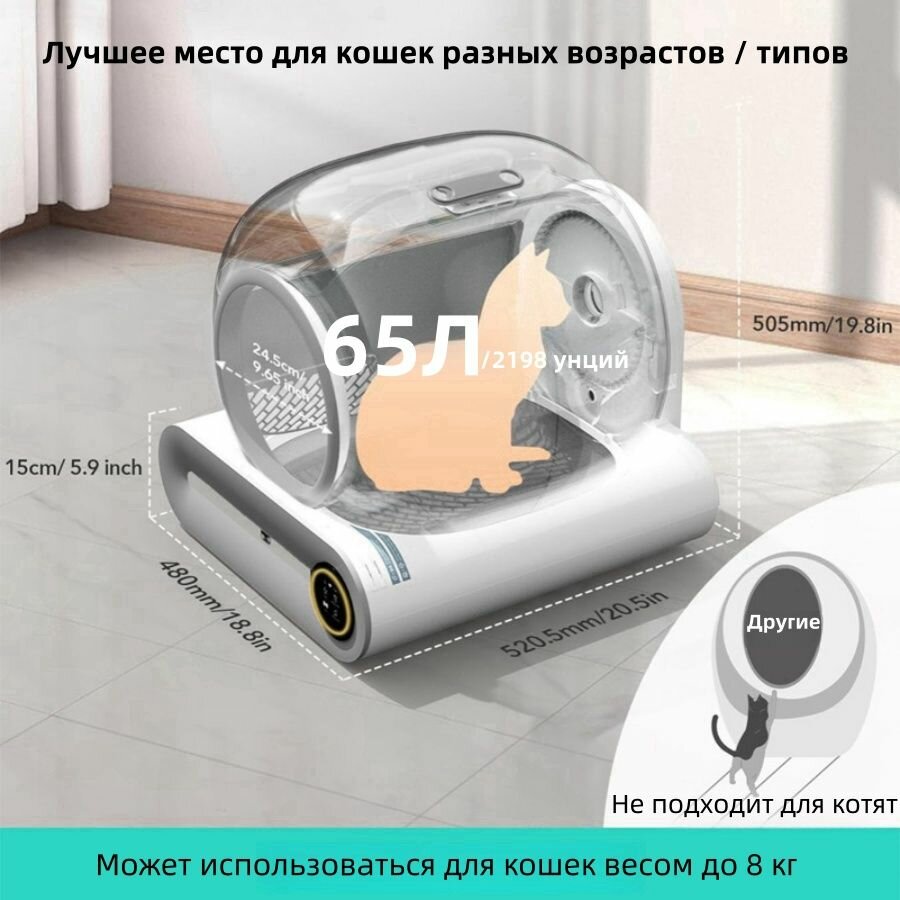 Автоматический лоток для кошек Tonepie Из чего состоит лоток? - База с мотором - Барабан - Фильтрующая сетка - Датчики гравитации и инфракрасный датчик - Силиконовое дно - Фильтрующая сетка - Отсек для отходов - Сенсорная управляющая панель - Вентилятор - Ионизатор - Встроенный Wi-Fi Как это работает? Датчики гравитации и инфракрасный датчик распознают вашу кошку по весу или теплу. После того как кошка сходит в лоток запускается уборка. Наполнитель просеивается через специальную сетку. Все отходы попадают в пакет для отходов. Преимущества - Любой наполнитель. Параметры наполнителя гибко настраиваются в приложении - Самый маленький по габаритам в своем классе, при этом реально большой внутри - 9L литров, кошка до 8кг . Размеры глубина 52,5 , высота 50.5, ширина 48 сантиметров - Минималистичный дизайн - Тройная защита от запаха (герметичный отсек для отходов, встроенный вентилятор, ионизатор) - Режим авто-уборки. Включили и совсем про него забыли. Уберет сам и сам включит ионизатор - Увеличенный отсек для отходов. До 15 дней без уборки. Это самый большой отсек для отходов из автоматических туалетов. Бак расположен сверху. Не нужно нагибаться для смены пакета - Полное управление с телефона и мониторинг. Наконец то можно спокойно оставить кошку одну дома - Wi-Fi. Интеграция в умный дом Smart life Боится ли кошка лоток? Нет, кошки его обожают. Для них это домик и интересная игрушка. Комплектация туалет для кошек, инструкция, 10 пакетов