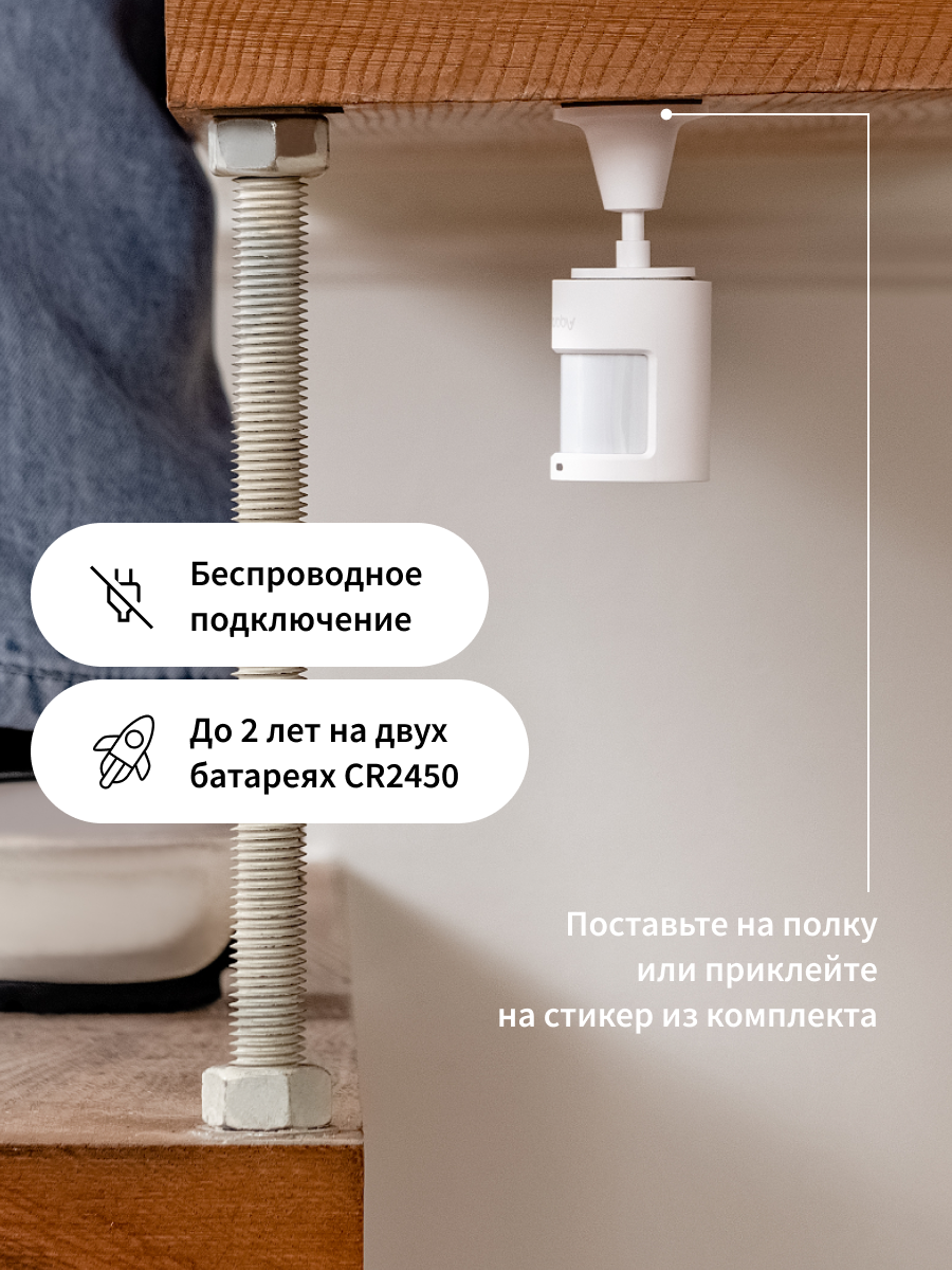 Работает на двух батареях CR2450 до двух лет*. При низком уровне заряда батарей вам придёт уведомление на смартфон.
