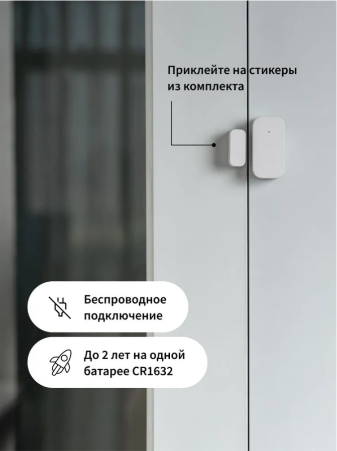 Умный датчик состоит из двух частей: одна крепится на дверной косяк или оконную раму, другая — на саму дверь или створку окна. Когда вы открываете дверь, контакт между двумя частями теряется, когда закрываете — восстанавливается. С любым из событий, также с нахождением в закрытом или открытом состоянии, можно настроить автоматизацию — и умный датчик будет отдавать сигналы на запуск других устройств.