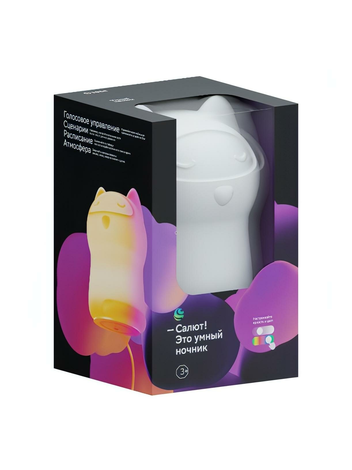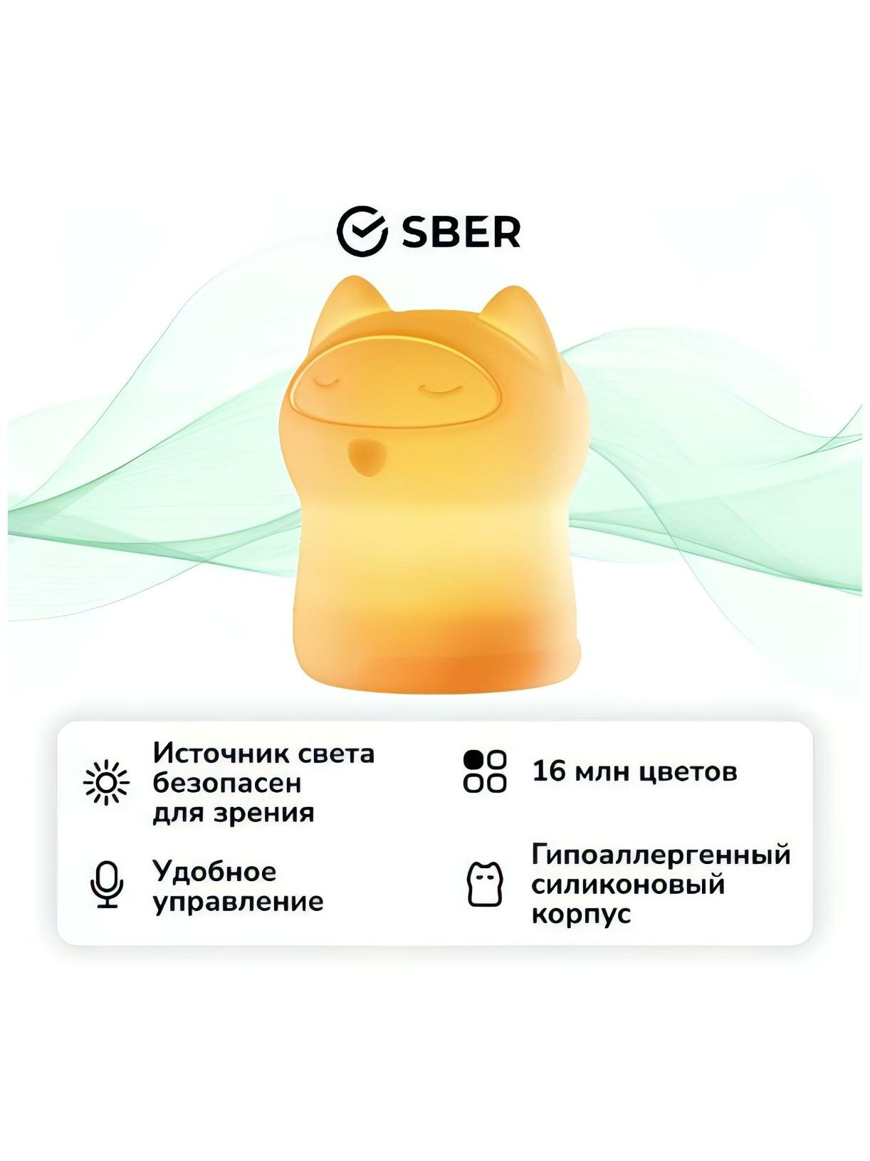 Умный детский ночник Sber SBDV-00125 дополняет интерьер детской комнаты, обеспечивает комфортный сон ребенка. Встроенные 16 млн цветов обеспечивают настройку яркости, можно менять цвет и температуру. Световой поток равен 200 Lm. Корпус сделан из безопасного и безвредного силикона белого цвета, мягкого на ощупь. Модель сделана в форме кошки. Прибор работает от сети. Управление происходит со смартфона. Встроен голосовой помощник Салют. Габаритные размеры - 115х112х148 мм. Вес равен 340 г. В комплект входит театр теней.