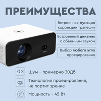 В комплект поставки входят проектор, штатив для проектора, кабель питания, кабель HDMI, батарейки ААА, пульт управления и инструкция. Поддержка FULL HD, 4K, автофокусировка, Wi-Fi 6 , Android 11, HDMI, Bluetooth