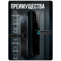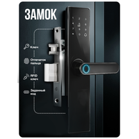 Замок открывается с помощью отпечатка пальца, RFID-карт Mifare, индивидуальных кодов и мобильного приложения. Совместимость с Ps-Link, Tuya и Smart Life обеспечивает простую интеграцию в систему «умный дом». Благодаря подключению по Wi-Fi вы можете удалённо управлять доступом, просматривать журнал событий и выдавать временные ключи для гостей или персонала.