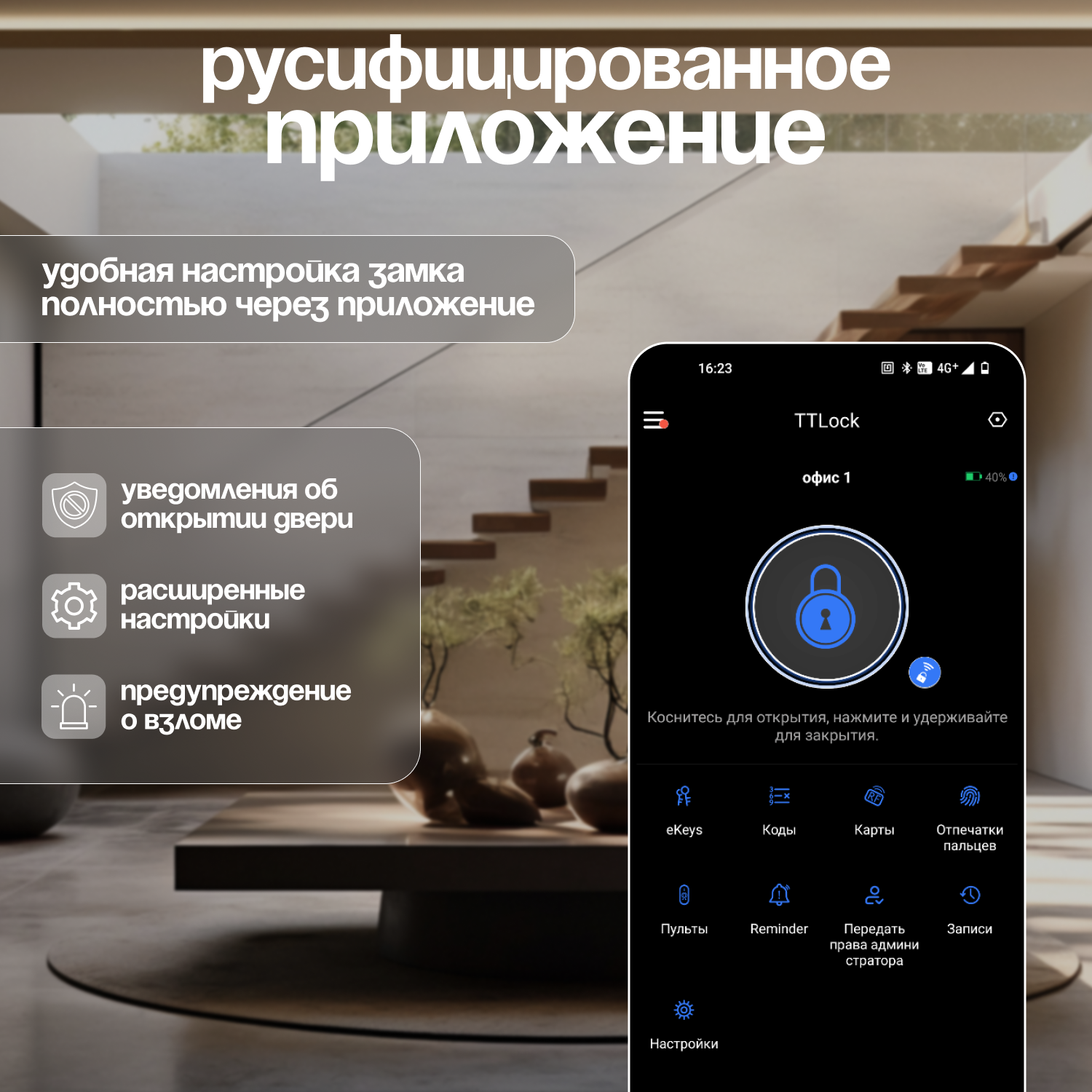 Умный замок на дверь с Wi-Fi и отпечатком пальца оснащен аккумулятором, который обеспечивает длительное время работы без подзарядки. Кроме того, он имеет защиту от взлома и антивандальный корпус, что делает его надежным и безопасным выбором для вашего дома.