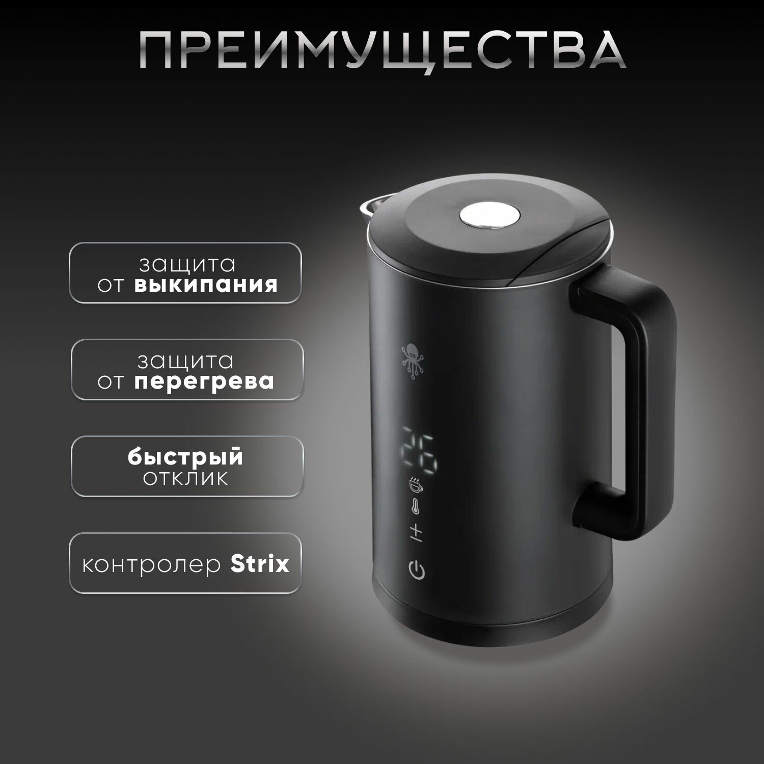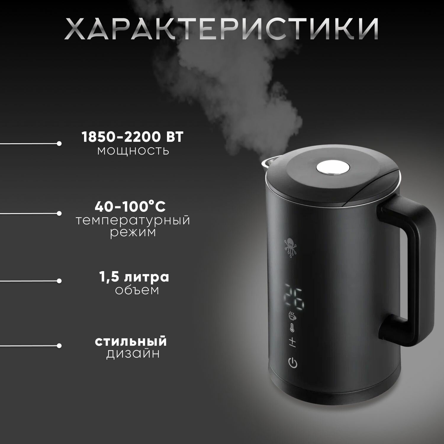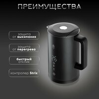 Чайник нового поколения. Лаконичный дизайн, интуитивно понятное управление и широкий функционал дают преимущество KET-6 перед конкурентами. Дистанционное управление. С помощью приложения SLS Вы сможете управлять чайником даже находясь вдали от него: активация, установка температуры, создание расписания работы - эти и многие другие функции становится доступны для КЕТ-6 после его интеграции в Вашу домашнюю экосистему. Работа с голосовыми помощниками. KET-6 поддерживает работу с наиболее распространёнными голосовыми ассистентам: Алиса. Автоматизация работы. Одна из отличительных особенностей экосистемы SLS являются сценарии. Сценарий - это настраиваемая пользователем цепочка действий, в которую включены два и более девайсов. Данная функция позволит Вам автоматизировать работу KET-6. Безопасность и долговечность. Корпус чайника выполнен из нержавеющей стали и высококачественного пластика, что является залогом долгой службы, а защита от перегрева и выкипания вкупе убережёт чайник от быстрого изнашивая, тем самым продлив его жизнь.