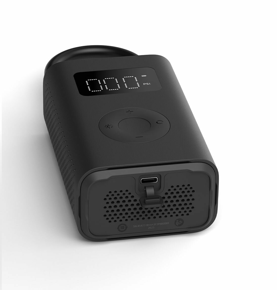 вид - однопоршневой, вид манометра - цифровой, встроенный фонарь, мощность - 10 Вт, автостоп, размеры - около 123 x 75.5 x 45.8 мм (без воздуховода), емкость аккумулятора - 2000 мА*ч, время зарядки - около 3 ч, уровень шума - менее 80 дБ, интерфейс зарядки - USB Type-C, точность датчика - 0.070307 кг/см2