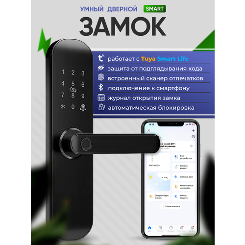 Умный дверной замок Smart Door Lock Tuya выполнен в стильном корпусе и обладает высоким уровнем механической и электромагнитной защиты. В замке использованы датчики безопасности, которые эффективно защищают входную дверь от попыток грубого вскрытия или вскрытия с помощью высоких технологий. Сканер отпечатков пальцев расположен непосредственно на ручке открытия.