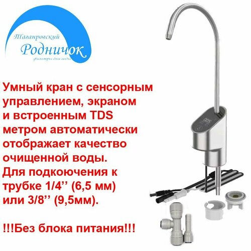 Кран для питьевой воды Родничок сенсорный с экраном и TDS метром, исполнение 15 выполнен из долговечной коррозионно стойкой шлифованной нержавеющей стали (марки 304). Увеличенный диаметр подключения и носика позволяет комфортно набирать большой объем очищенной воды на меньшее время (при условии подключения трубкой 3/8")