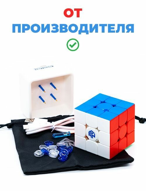 Куб, док-станция для зарядки, провода для подключения, фирменный мешочек-чехол, инструкции по управлению и сборке GanCube, набор запасных пружинок для точечной регулировки