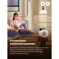 Многофункциональный датчик температуры Aqara W100 в связке с хабом Aqara M3 позволяет не только отслеживать микроклимат, но и управлять кондиционером. Через хаб Aqara M3 можно добавить кондиционер, подключить умный датчик температуры и влажности Aqara T1 и многофункциональный датчик температуры Aqara W100. В результате в системе будут отображаться показания сразу с трёх устройств: многофункционального датчика Aqara W100, датчика T1 и самого кондиционера. Более того, через Aqara W100 можно напрямую управлять температурой кондиционера, а также настраивать гибкие сценарии — например, автоматически включать охлаждение при повышении температуры или влажности, либо выключать кондиционер, когда параметры достигают комфортного уровня.