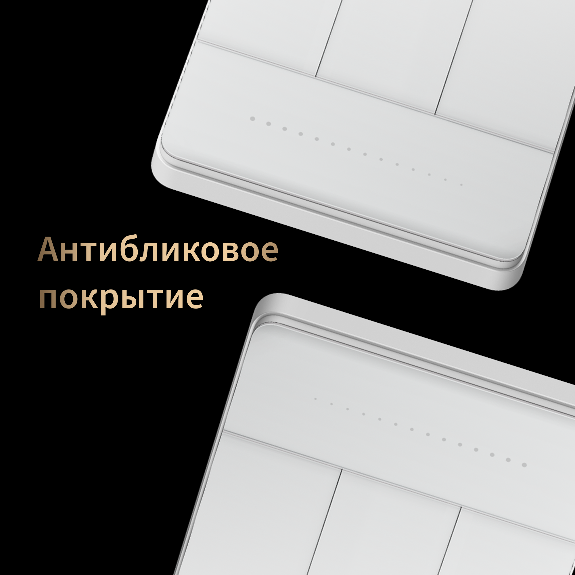 Выключатель выполнен в стильном дизайне: матовая поверхность, антибликовое покрытие, устойчивость к отпечаткам пальцев и лёгкое нажатие кнопки.