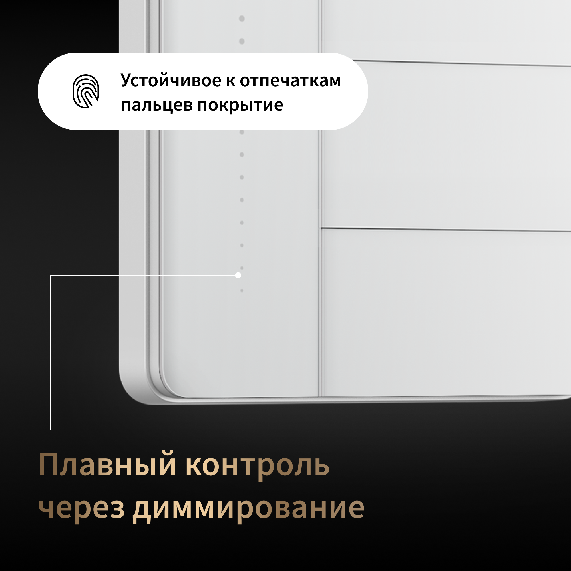 Выключатель выполнен в стильном дизайне: матовая поверхность, антибликовое покрытие, устойчивость к отпечаткам пальцев и лёгкое нажатие кнопки.