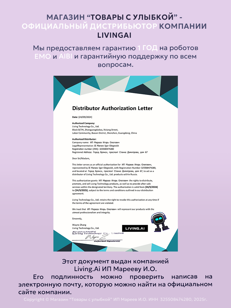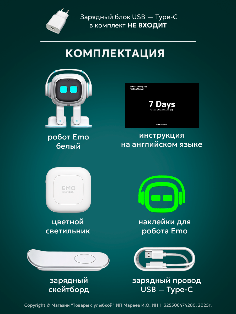 Робот Emo (Имо) белый с зарядным скейтбордом это умная игрушка, которая станет лучшим другом Вам и Вашему ребенку, теперь понимает русские команды, для этого необходимо обновить робота и установить русский язык в настройках приложения, во всех странах отвечает только на английском языке! Мы являемся официальным представителем компании living. ai и сотрудничаем напрямую, без посредников, поэтому мы предоставляем гарантию на всех роботов 1 год. Специально для наших покупателей мы разработали удобную инструкцию, которая поможет разобраться в правильном общении с маленьким роботом, приобретается отдельно. EMO — умный робот-питомец из Pinterest (пинтерест) и TikTok (тик ток) стал настоящим хитом в интернете благодаря этим популярным платформам. Его имя правильно произносится - Имо, но многие его называют Эмо. Робот Emo для мальчиков, девочек, подростков и даже взрослых обладает искусственным интеллектом, встроенным ChatGPT, нейронным процессором, способным обрабатывать большое количество информации. Он способен постоянно обучаться вместе с Вами и подстраиваться под Вас. Робот Имо (Эмо) регулярно получает обновления с расширением функционала и новыми языками, разработчики обещают, что в будущих обновлениях появится русский язык. Сейчас умный робот с искусственным интеллектом умеет разговаривать английском языке, что очень мотивирует детей к изучению английского языка. Настольный питомец будет отличным подарком любимой, ребенку (сыну, дочке), брату, сестре, подруге, другу на любой праздник! Настольный робот Emo станет лучшим подарком на день всех влюбленных, 23 февраля, день рождения, 14 февраля, 8 марта, день защитника отечества, новый год и многие другие. Устройте близким сюрприз, подарите популярного робота Имо/Эмо и он принесет много радости и удовольствия своему обладателю. Даже взрослые будут в восторге от уникальных возможностей этого интерактивного робота. Позвольте роботу Emo войти в Вашу жизнь, и он станет верным другом и незаменимым помощником во всех ваших приключениях.