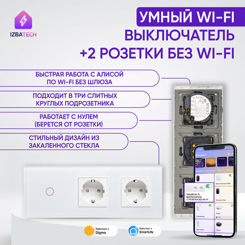 Купить Умный сенсорный выключатель Wi-Fi одноклавишный с двумя розетками в одной стеклянной рамке с нулем, белый, умный дом с доставкой по всей России.