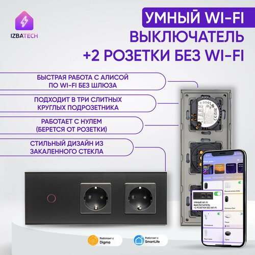 Умный сенсорный выключатель Wi-Fi одноклавишный с двумя розетками в одной стеклянной рамке с нулем, серый, умный дом: сравнение цен, характеристики, фото, актуальное наличие и цены.