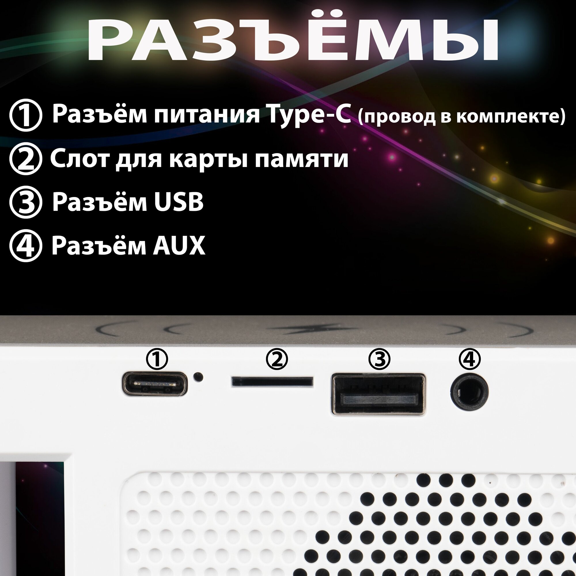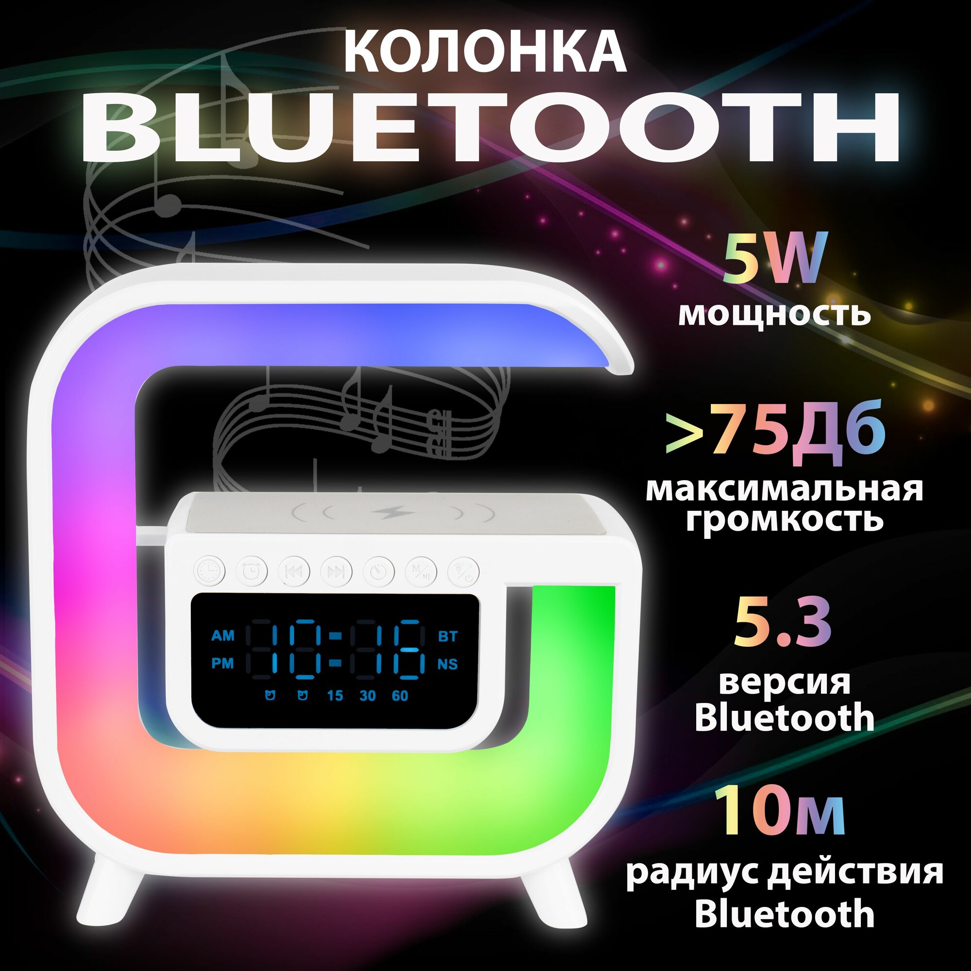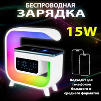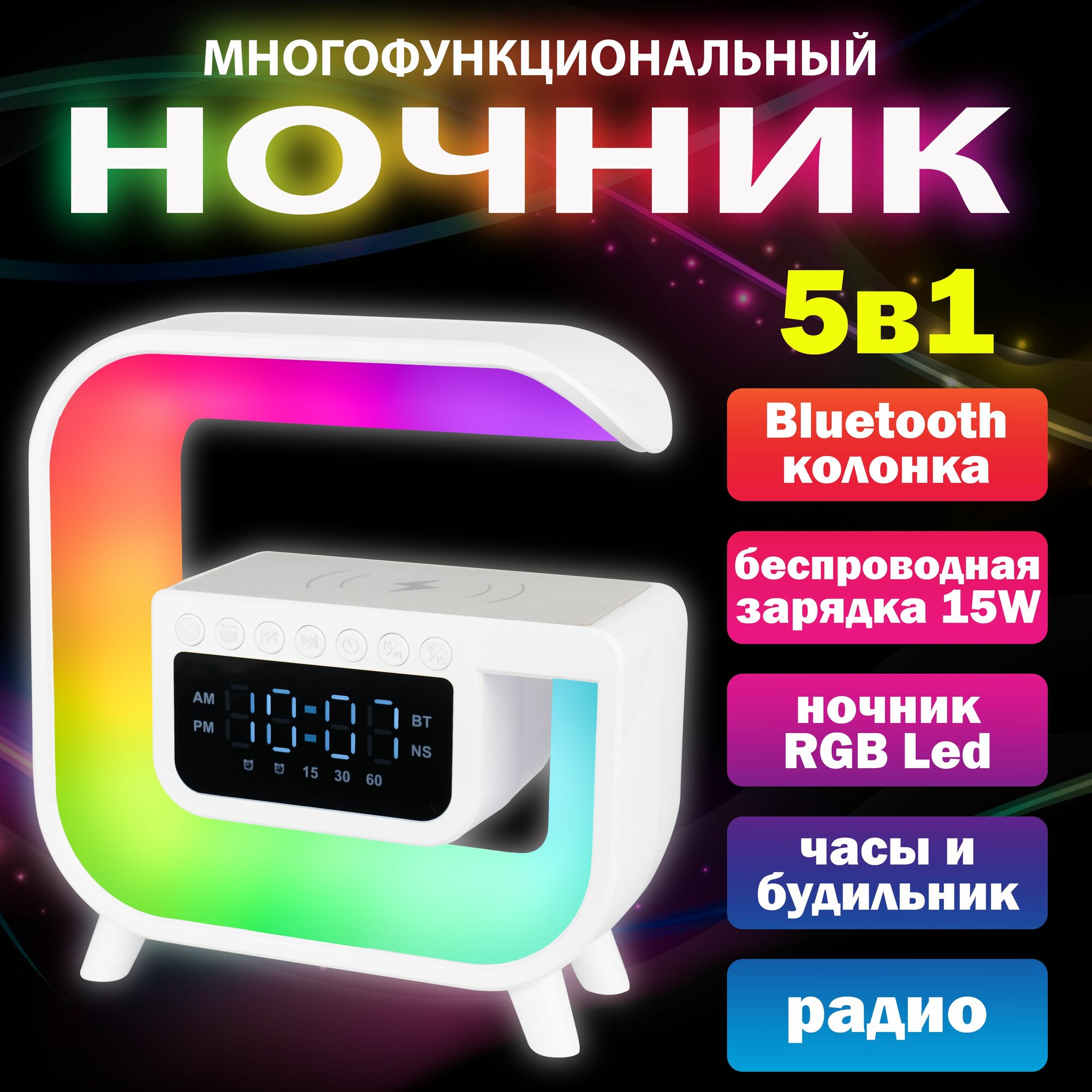 Многофункциональная беспроводная колонка-зарядка с атмосферной подсветкой.