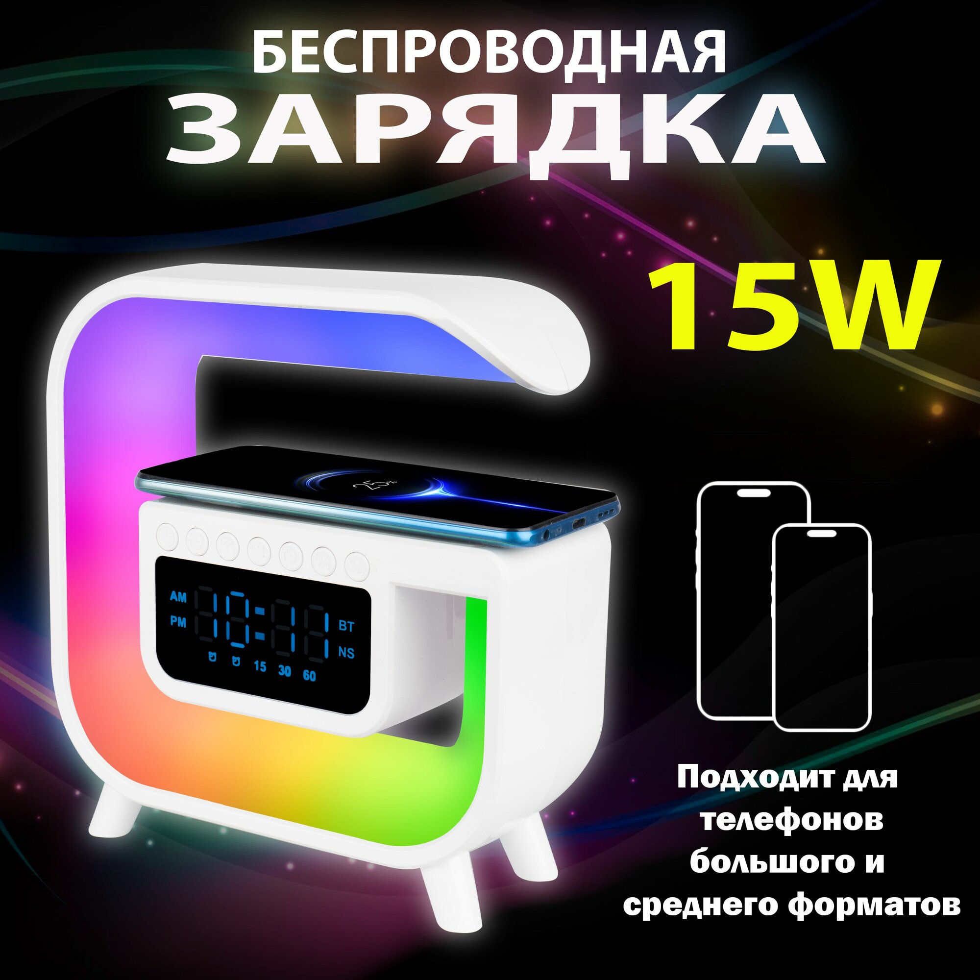 Беспроводная мощная зарядка 15 W, подходит для всех смартфонов с функцией беспроводной зарядки. В момент зарядки, лампа должна быть подключена К 220 В.