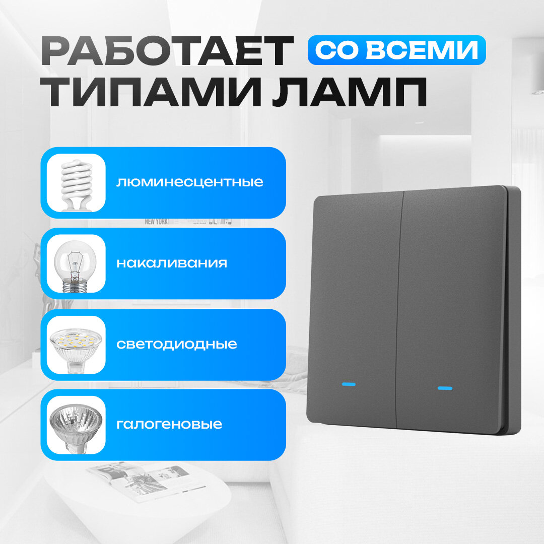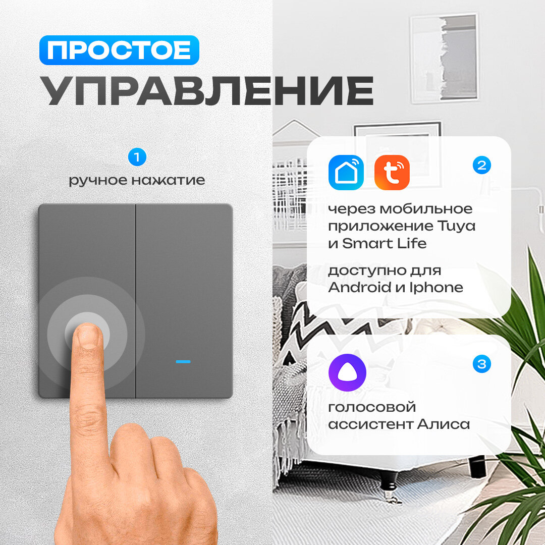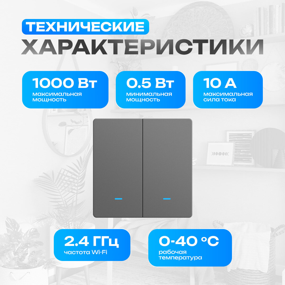 Умный выключатель с Алисой, двухклавишный кликер, Wi-Fi переключатель света с индикатором подсветки, серый: сравнение цен, характеристики, фото, актуальное наличие и цены.