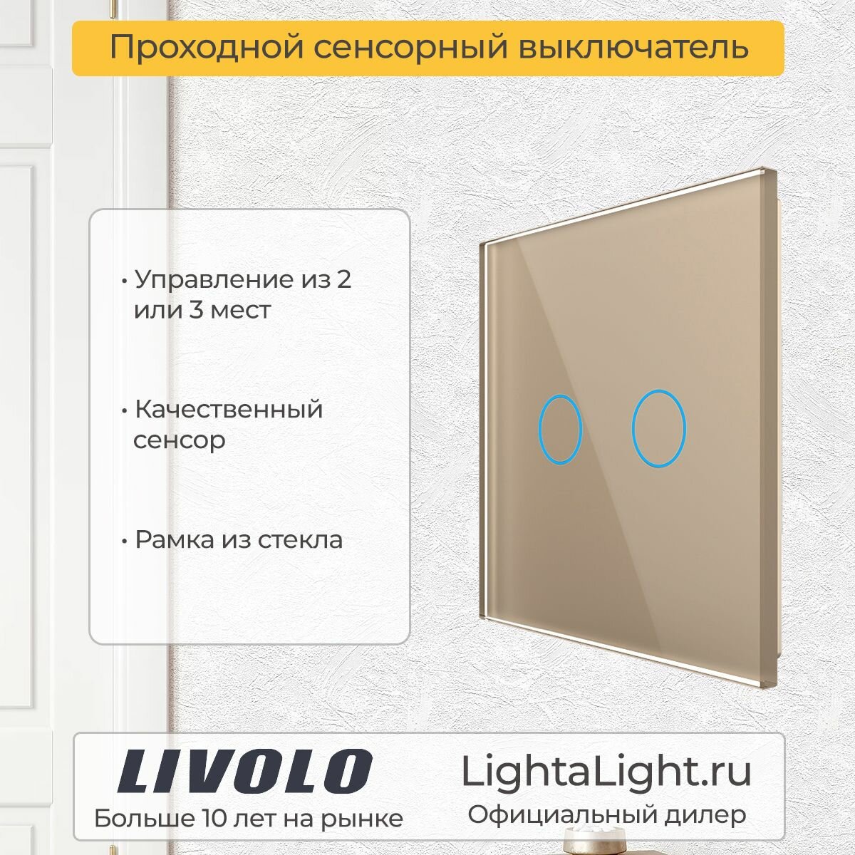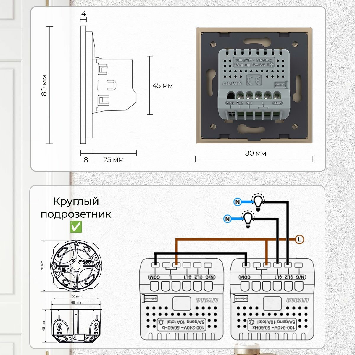 Двухклавишный проходной умный сенсорный выключатель протокол EC на 1 пост со стеклянной лицевой панелью VL-C702SZ2-13 золотого цвета предназначен для управления двумя линиями нагрузки. Поддерживает управление лампами любого типа. Включение/выключение освещения осуществляется одним легким прикосновением. Мягкая светодиодная подсветка позволит с легкостью найти выключатель в темном помещении. Для управления освещением через приложение, выключатель необходимо подключить к шлюзу (блоку управления) VL-XG004. Управлять выключателем также можно и голосовыми командами, подключив его к голосовому помощнику Алисе (подключение к шлюзу обязательно). Выключатель не поддерживает управление с помощью дистанционного пульта LIVOLO. Данный маршрутизатор поддерживает только протокол протокол EC, для протокола ZigBee не подходит. Для установки выключателя не требуется переделывать проводку. Устанавливается в круглый подрозетник в комплекте со стеклянной лицевой панелью (в комплекте). Эксплуатация Коснитесь сенсора для вкл/выкл света. Выключатель имеет двухцветную светодиодную подсветку клавиши. Красный цвет - выключатель включен, синий цвет - выключен. Рабочее напряжение: 110-240 В, 50-60 Гц. Мощность нагрузки: 5 Вт/Клавиша - 1000 Вт/Клавиша. Выключатель может немного нагреваться, когда включен. Избегайте использования нагрузок, превышающих номинальный выходной ток 5 А/Клавиша. Подходит для эксплуатации с любыми типами ламп. Если выключатель не работает должным образом, отключите питание на 1 минуту, а затем снова включите. Если выключатель не подключен к шлюзу или сигнал шлюза слабый, светодиодная подсветка будет переключаться каждые 3 секунды. Срок службы: 100 000 переключений. Гарантия 12 мес. Настройка устройств протокол EC в приложении HOME Установите приложении HOME из App Store или Google Play. Зарегистрируйтесь и войдите под своим логином в приложение. В верхнем правом углу нажмите «+» и добавьте соответствующий блок управления умным домом (шлюз). Синхронизируйте блок управления умным домом (шлюз) в приложении, следуя инструкции. В верхнем правом углу нажмите «+» и добавьте соответствующее устройство. Синхронизируйте устройство в приложении, следуя инструкции. Комплектация Механизм выключателя. Металлический суппорт для крепления. Стеклянная панель. Монтаж Установка выключателей производится после завершения чистового этапа отделочных работ. В противном случае в них может попасть строительная пыль, клей, краска и др, что приведет к выходу механизма из строя. Не является гарантийным случаем! Достаньте комплектующие из упаковки. Обязательно отключите питание перед установкой. Поместите механизм выключателя в металлический суппорт. Подсоедините провода. Подключение должно выполнятся строго со схемой подключения. Главный выключатель: к клеммам L1 и L2 выключателя подключается нагрузка (соединительные провода от источника освещения - ноль), к клемме L подается питание (фаза). Второстепенный выключатель: к клеммам L1 и L2 ничего не подключается, к клемме L подается питание (фаза). COM-порты главного и второстепенного выключателей должны быть соединены между собой. Зафиксируйте механизм в подрозетнике с помощью винтов. Монтаж осуществляется в круглую монтажную коробку (подрозетник) с минимальной глубиной 40 мм. и диаметром 65-70 мм. Межцентровое расстояние для крепёжных ви