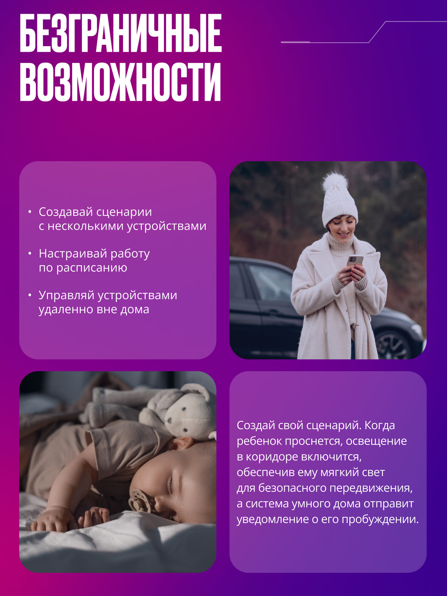 • Свет можно включать нажатием на круглую сенсорную кнопку с подсветкой, либо голосом. Алиса управляет каждой группами света отдельно, можно называть их как угодно и добавлять в сценарии. Также можно делать из них переключатели через сценарии в приложении Туя.